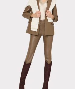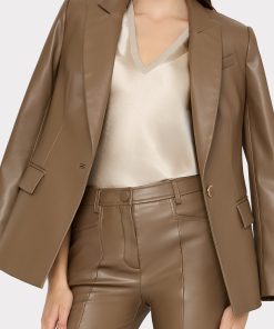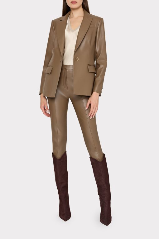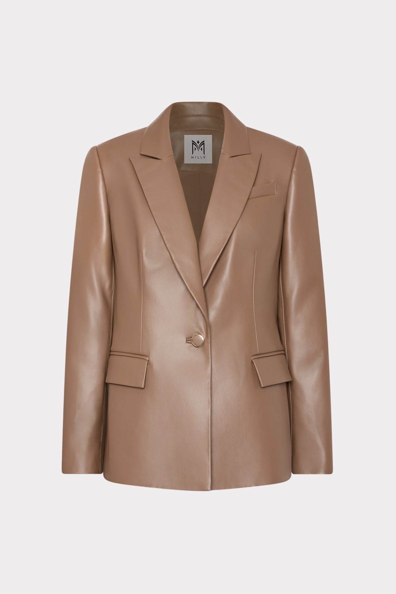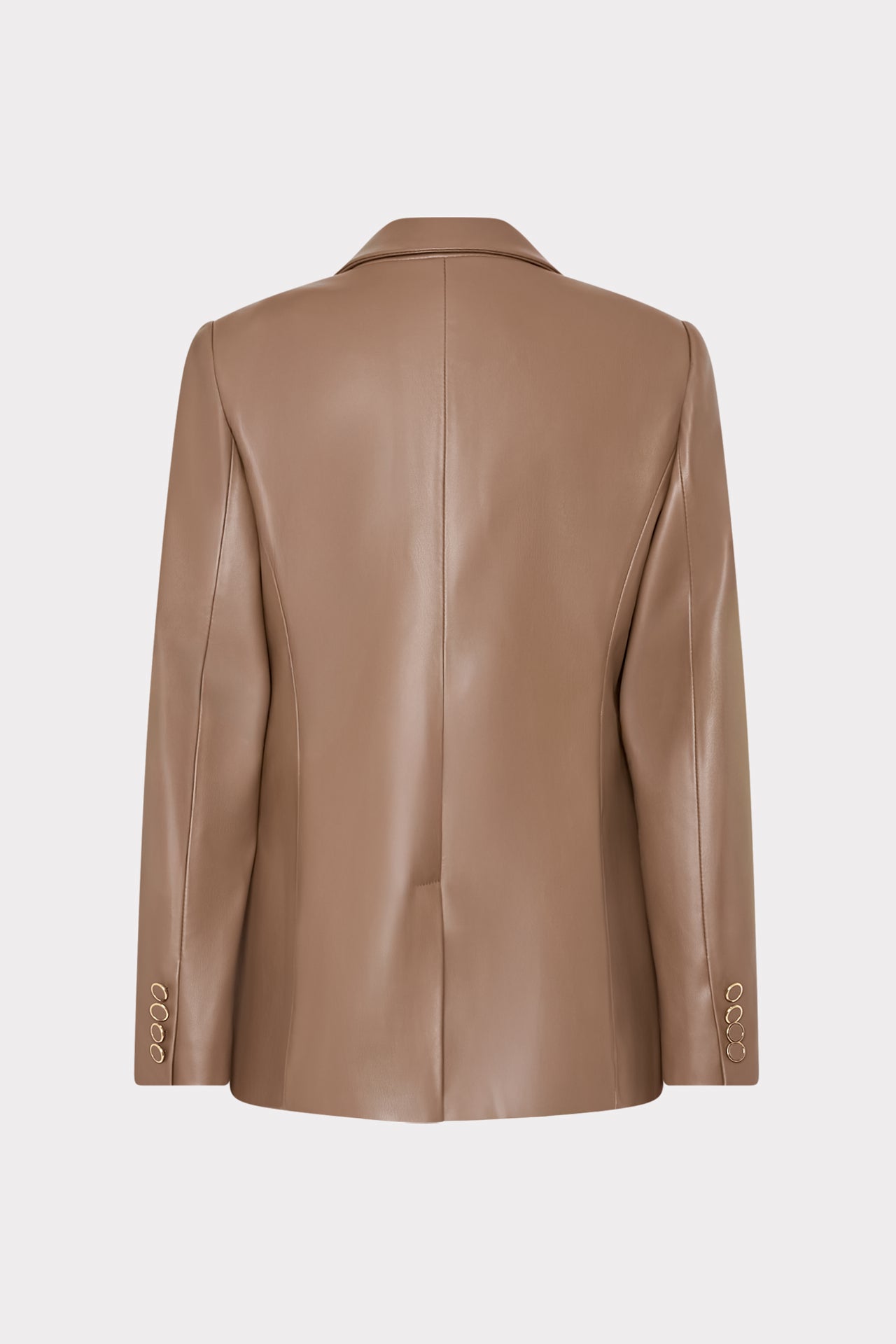 Cut from our buttery soft vegan leather that feels like the real thing, our classic Alexa blazer is fitted, has front pockets, and a single button that draws in the waist. Wear it with denim or its coordinating Rue faux leather pant.