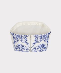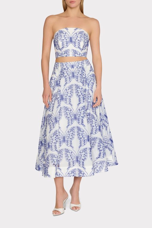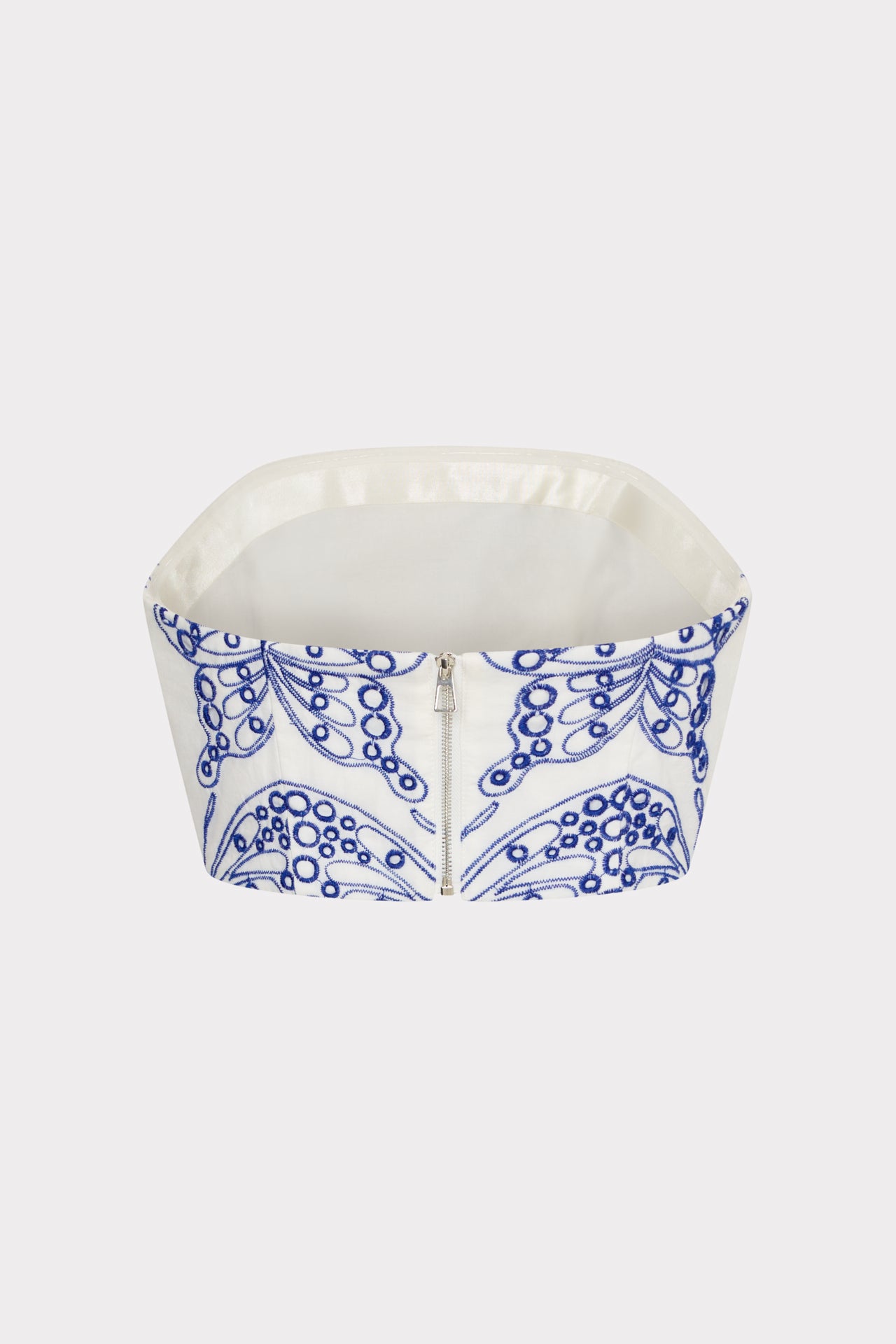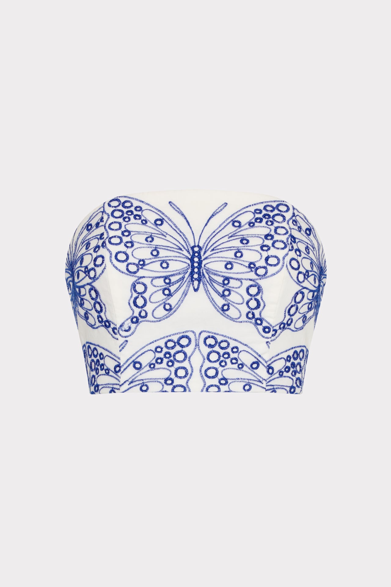 Built with all of the features of a highly functional crop top—boning on the side for support plus an elastic support band—our Butterfly Eyelet top is detailed with an elegant butterfly pattern across the bodice. It’s cropped and made to be worn with its coordinating Butterfly Eyelet midi skirt. It’s finished with an exposed back zipper to close.