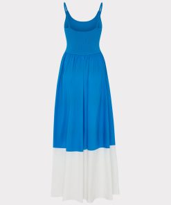 This camisole silhouette is a combination of knit on top with a cotton poplin color blocked maxi on the bottom. It’s the perfect summer weekend piece that can be dressed up or down.