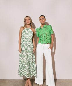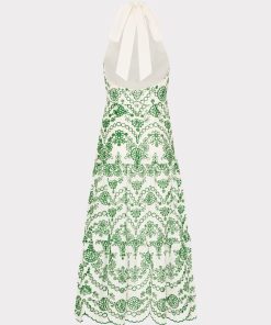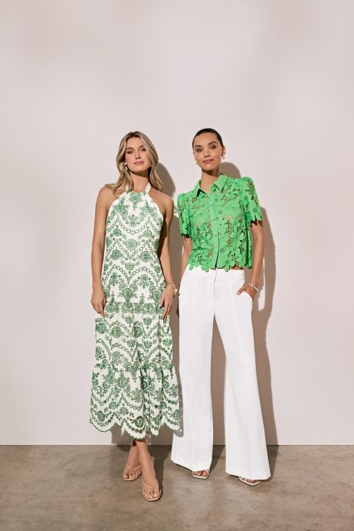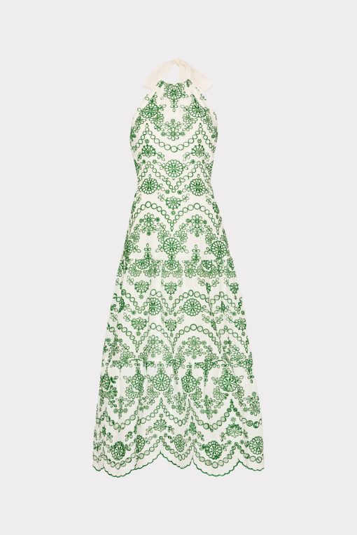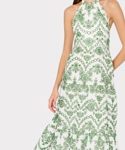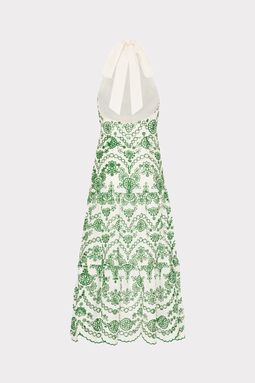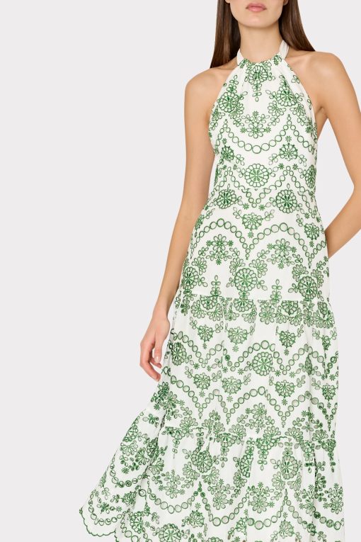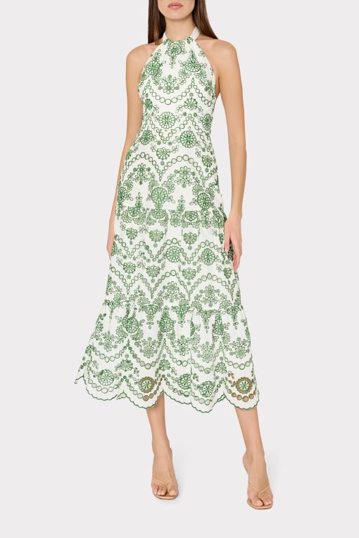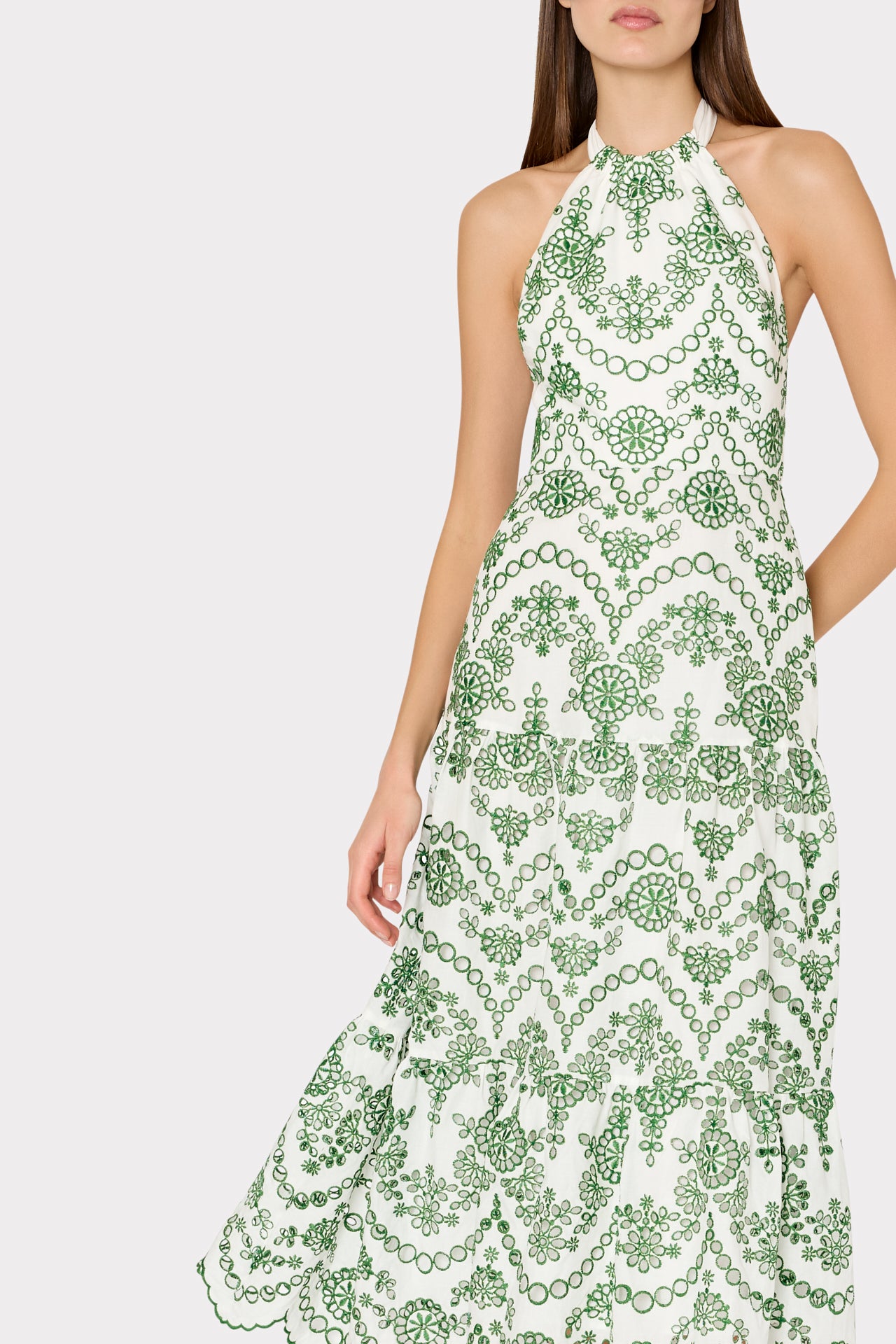 Make a statement with the Hayden Scallop Eyelet Dress. This midi dress features a luxurious halter neckline with a self tie at the neck, creating an elegant and sophisticated look. The tiered skirt and eyelet fabric add texture and dimension, while the scallop hem adds a touch of uniqueness. Complete with a back zipper closure for easy wear, all made with high-quality cotton for comfort and style.