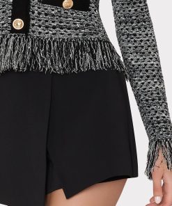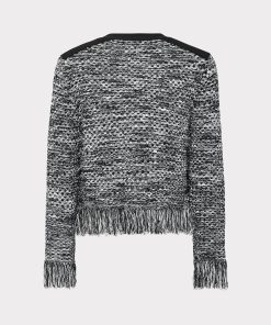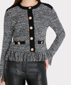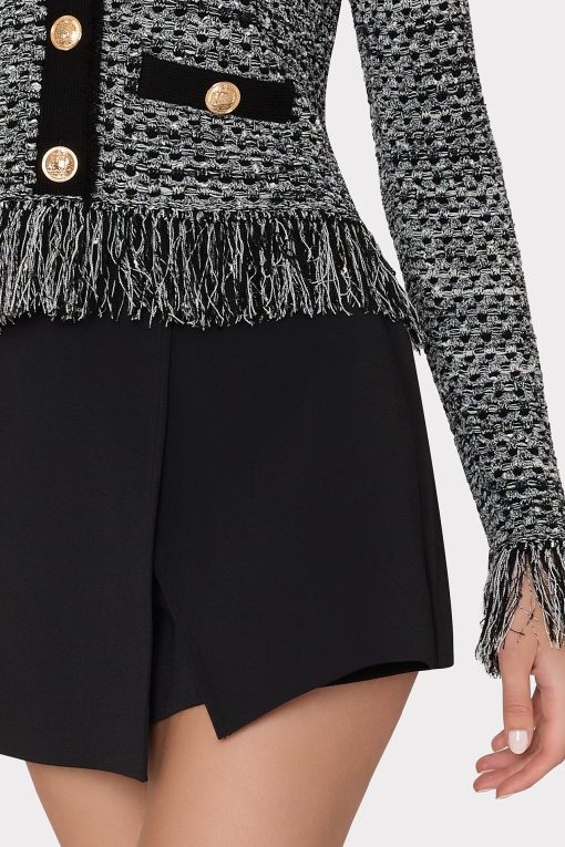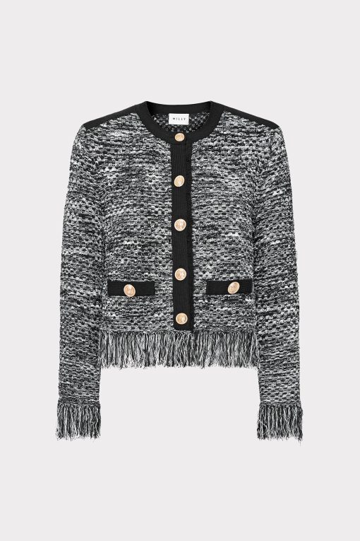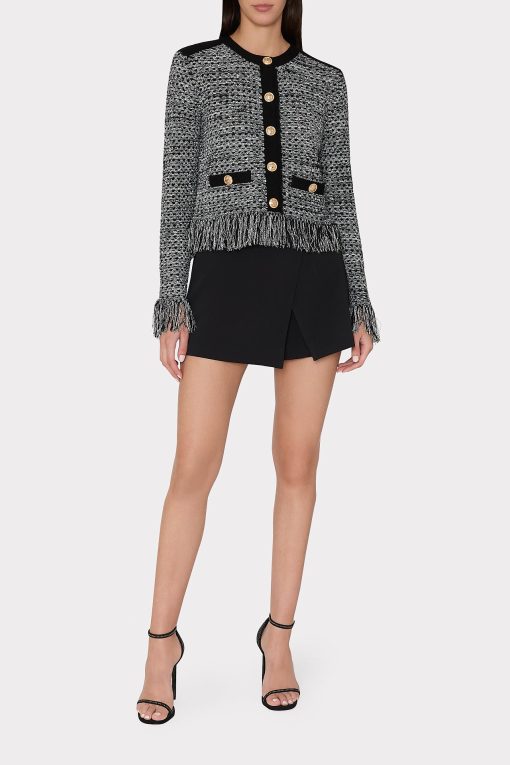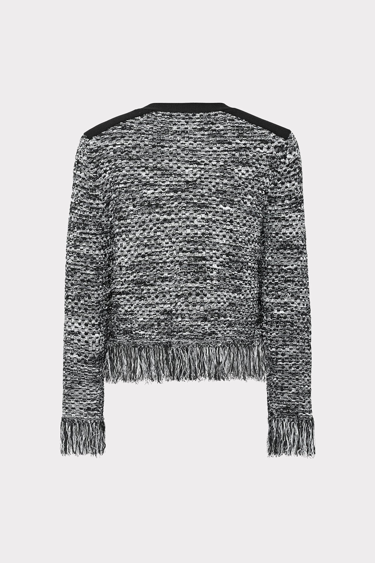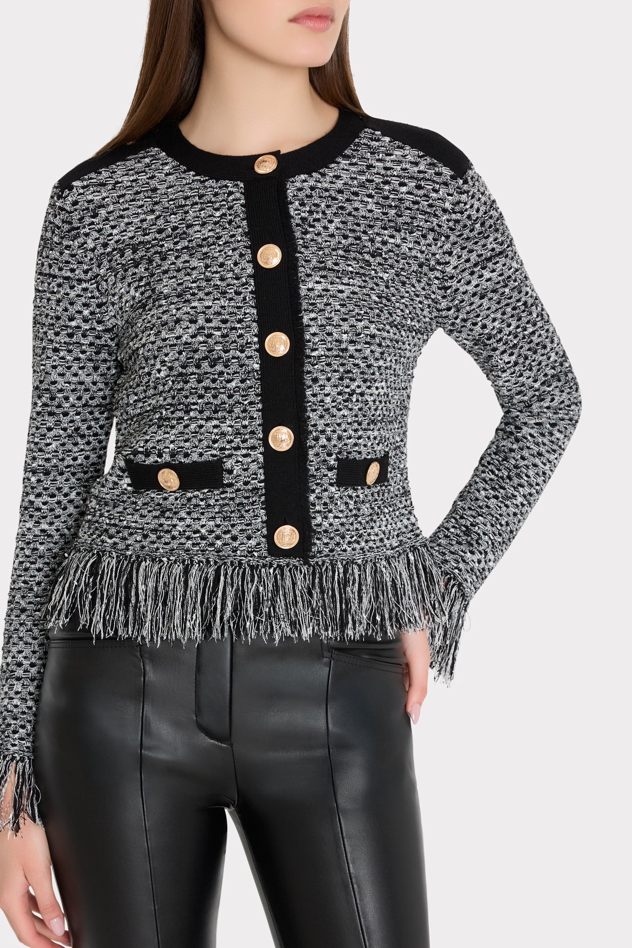 Our iconic cardigan jacket gets a new twist this season with fun, fringe detailing at the hemline. The intricate gold buttons can be fastened or worn undone. Pair it with your favorite tailored trousers or mini skirt.