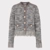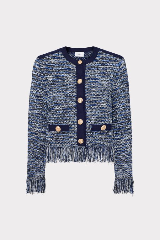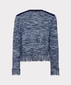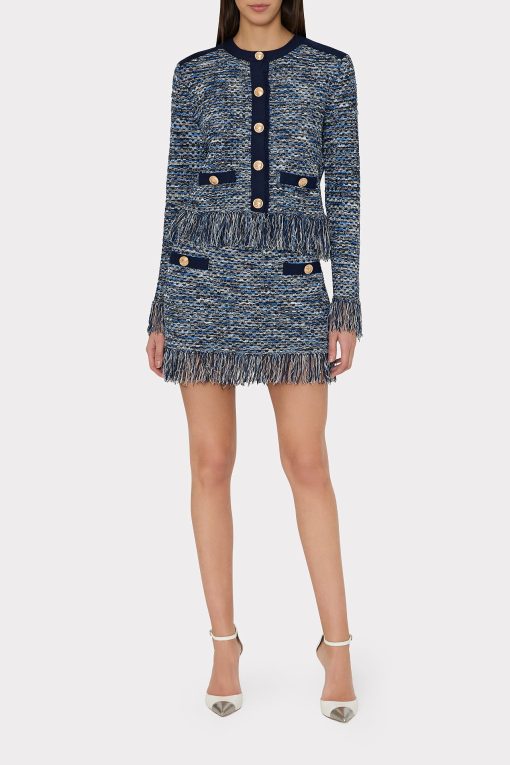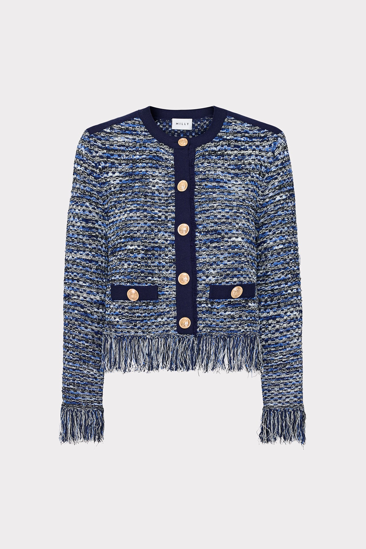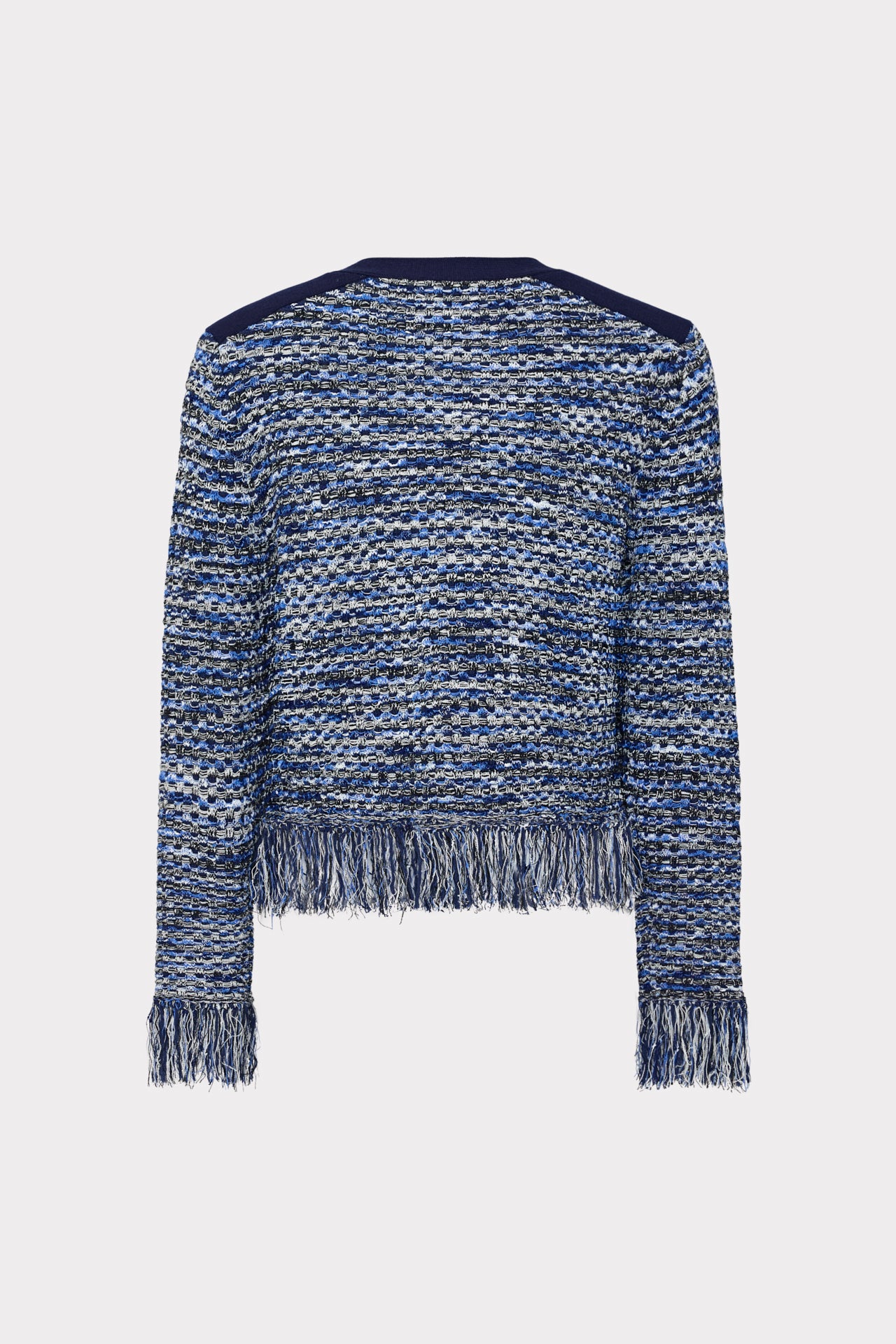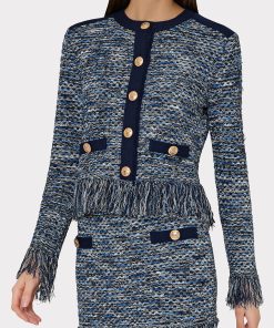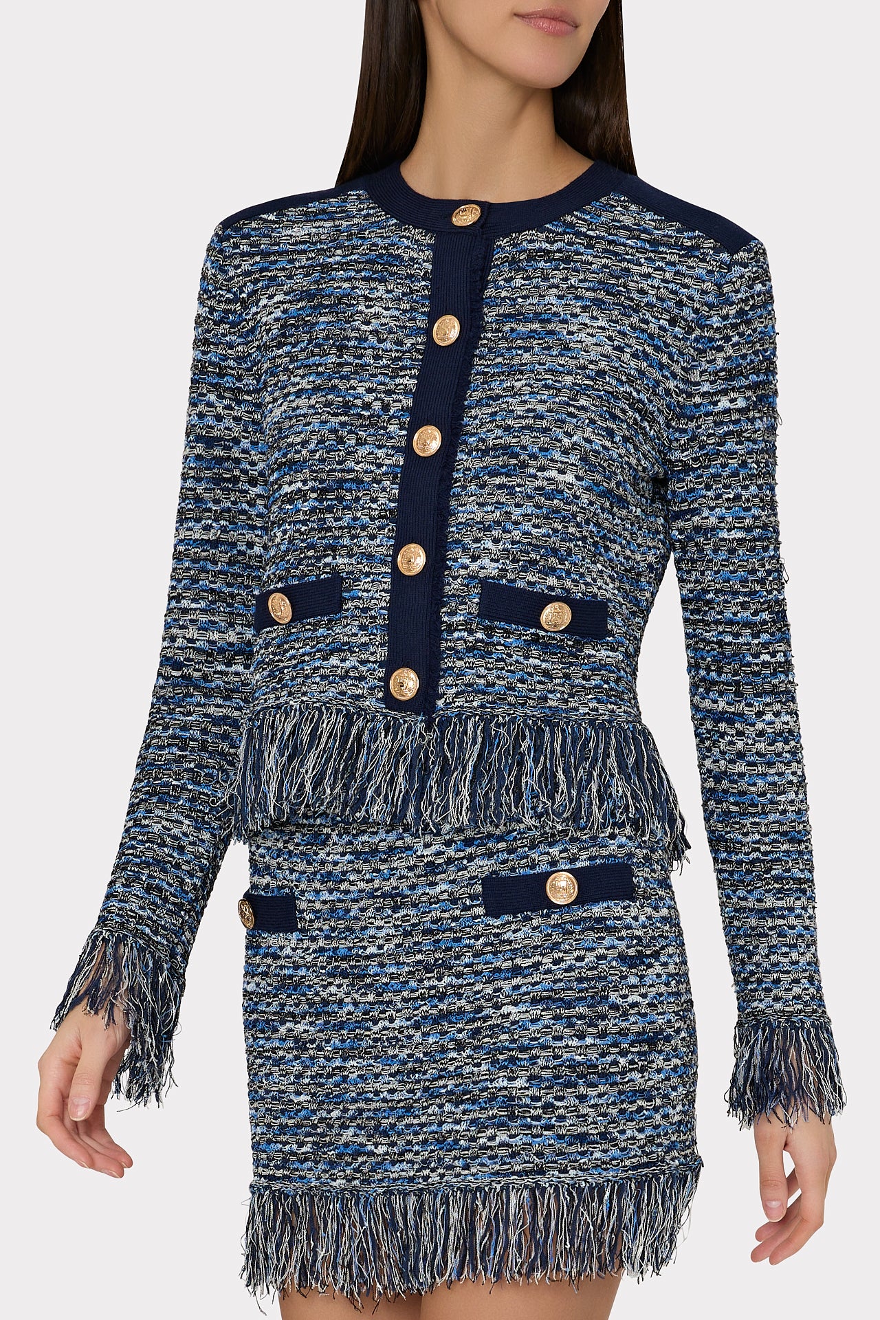 Our iconic cardigan jacket gets a new twist this season with fun, fringe detailing at the hemline. The intricate gold buttons can be fastened or worn undone. Wear it with its coordinating Kali Knit Mini Skirt or pair it with your favorite tailored trousers.
