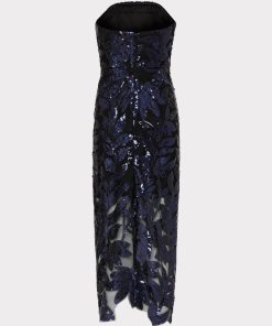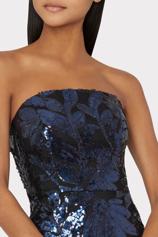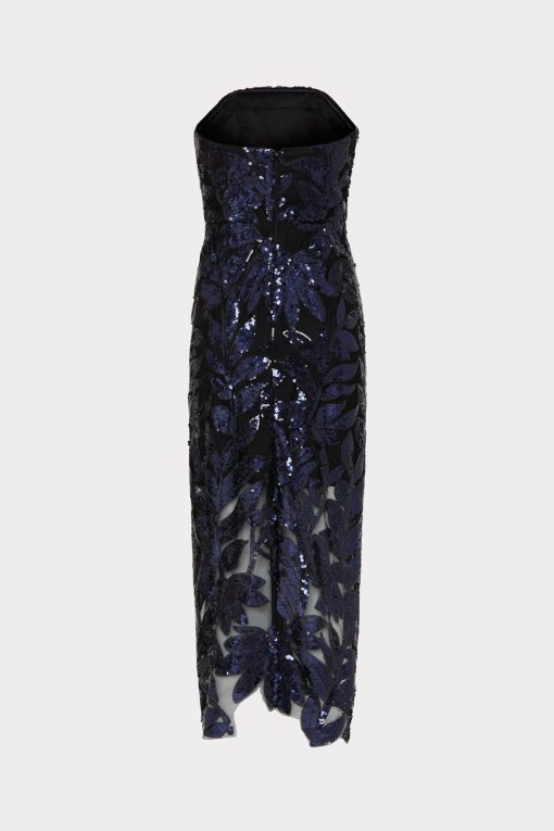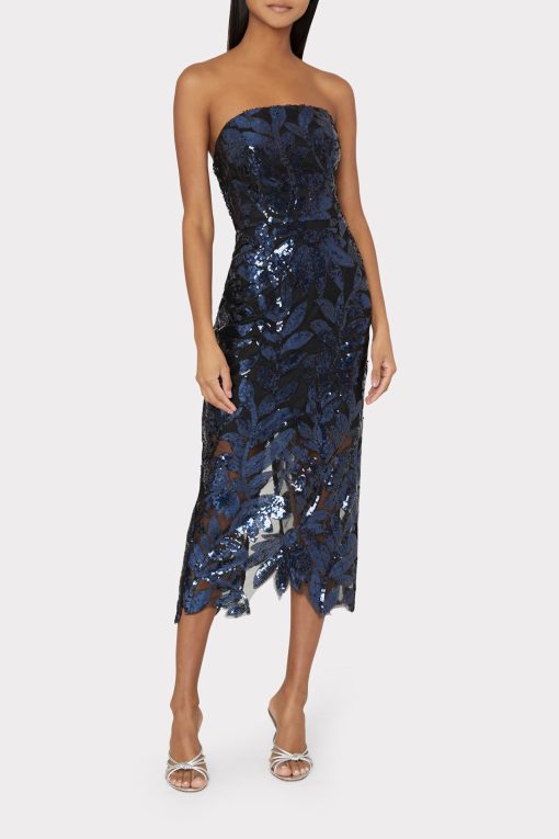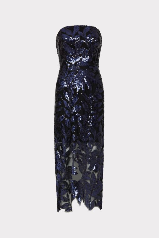 A floral sequin lace design is embroidered throughout this stunning, strapless tea length dress—a standout piece in the Pre-Fall collection. Every time you wear it you’ll feel glamorous, without sacrificing comfort.