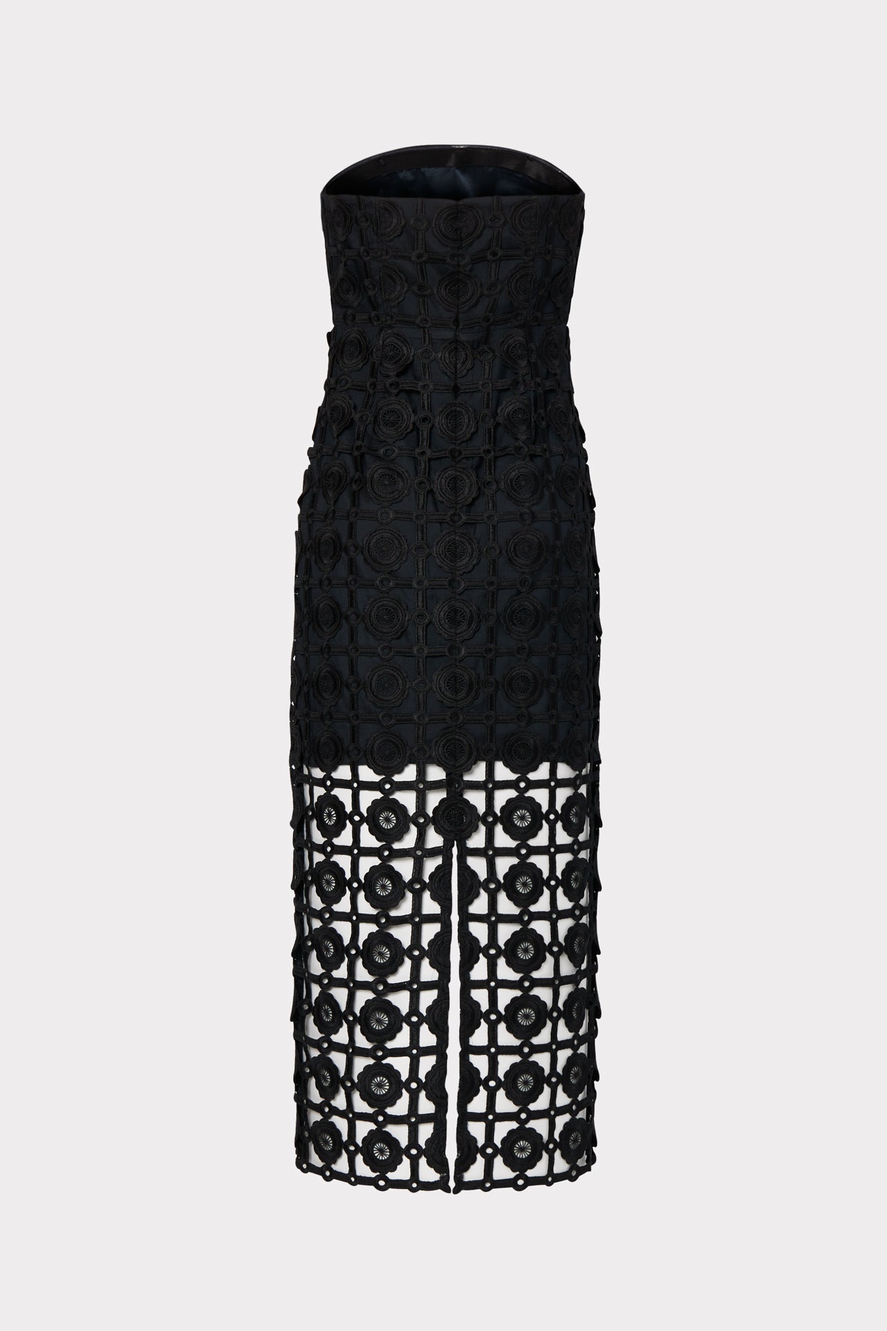 For your next exclusive party, bring the glamour with our strapless Kait dress. This ankle length dress features an artisanal, textured tile pattern that serves as an overlay to reveal bare legs past the knee. It has a boned-in bodice for shape and a chic, straight silhouette. Style yours with an ultra high heel.