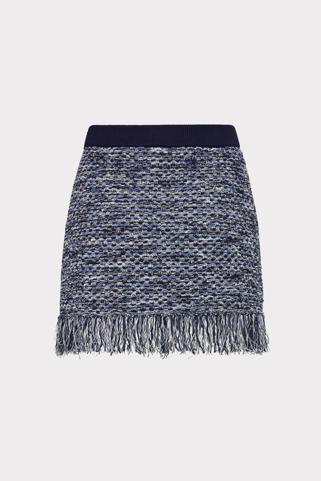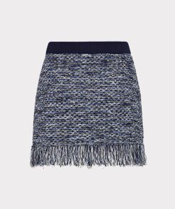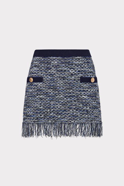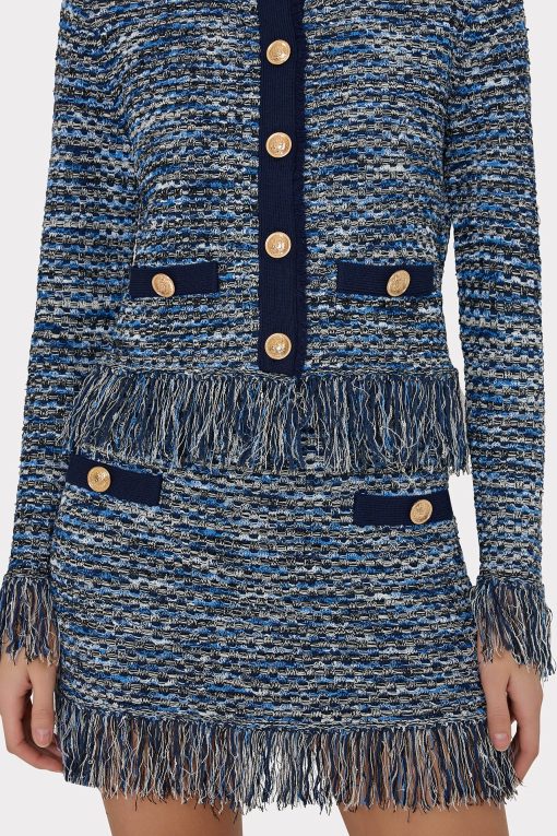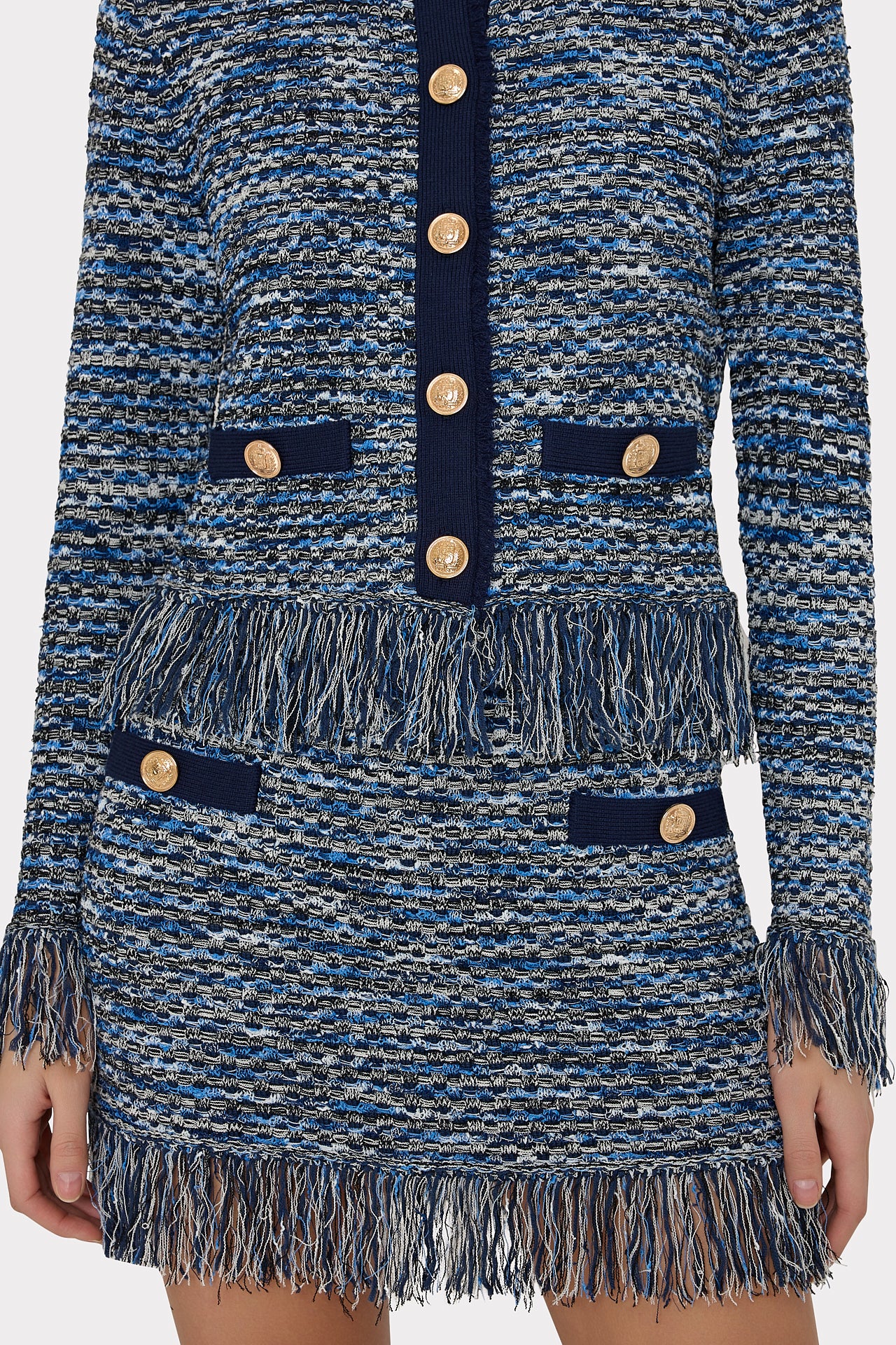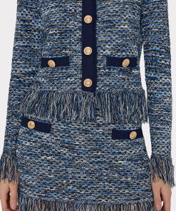 Crafted from heavy knit fabrication with tons of stretch, this mini skirt is adorned with prim pocket details, military-style gold buttons at the hip, and fringe at the hemline. For the full look, pair it with its coordinating Kaia Fringe Cardigan jacket.