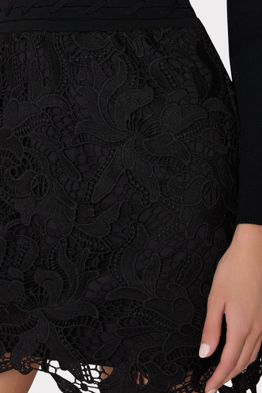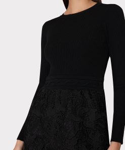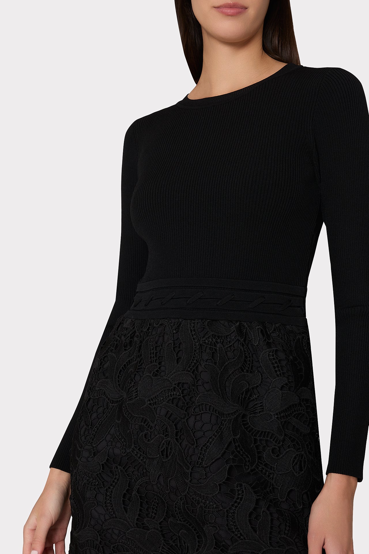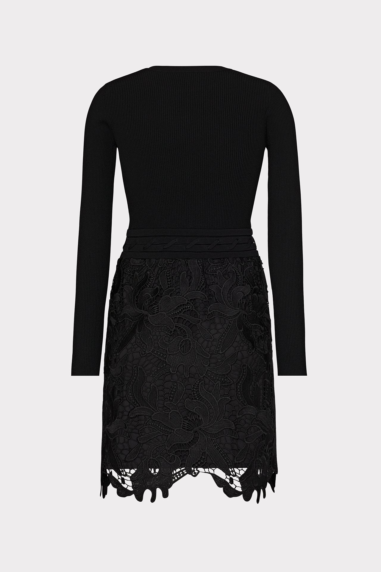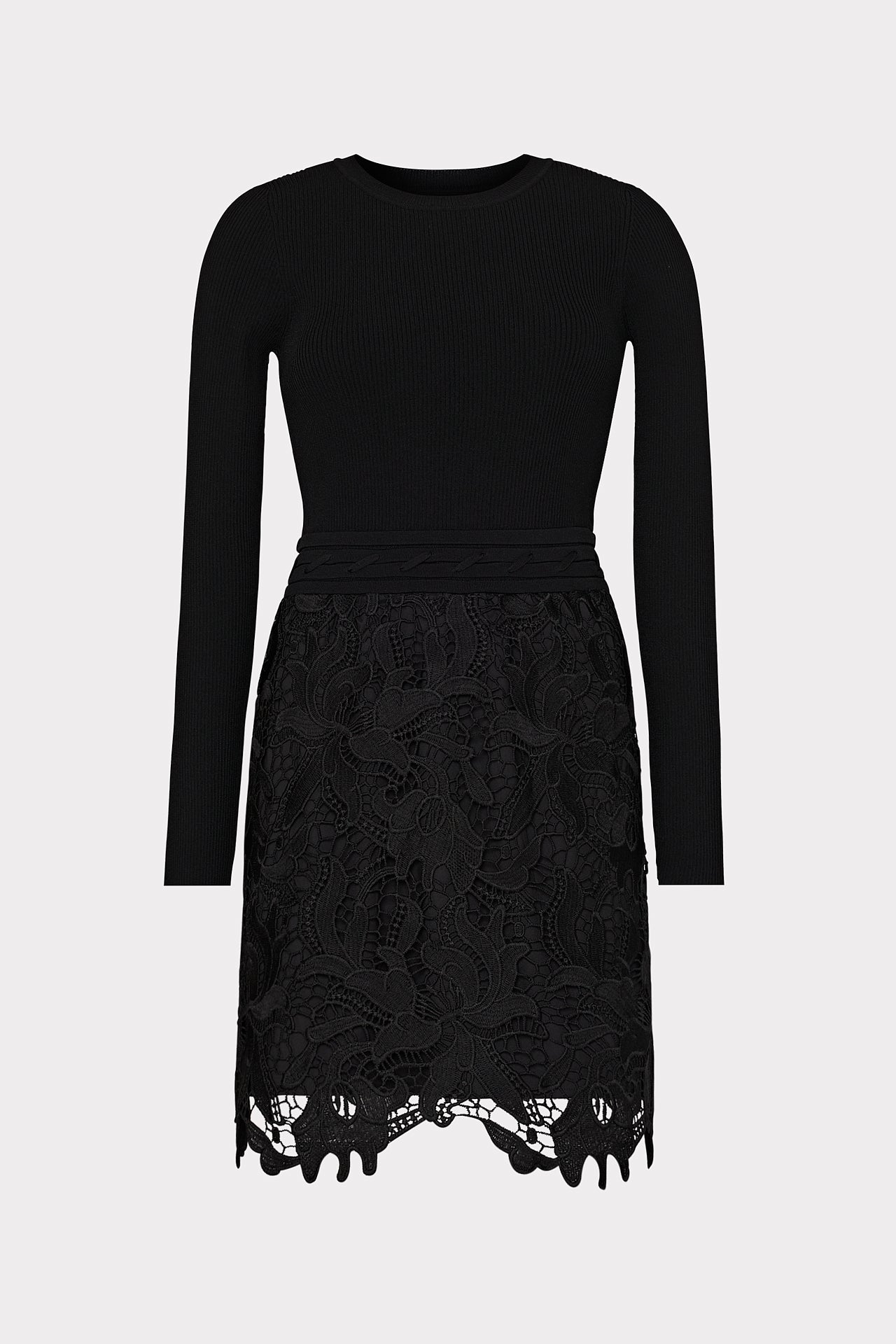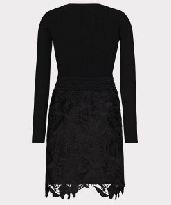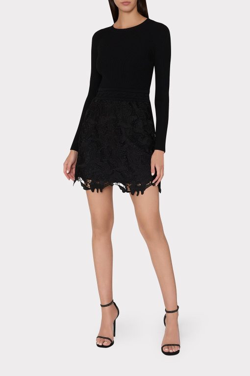 This mixed media dress style combines a cozy ribbed knit bodice and an feminine, lace skirt with a raw-edged hemline to create the appearance of a separate top and skirt. It’s accented with a lace-up detail at the waist. Style yours with a pair of heeled boots.