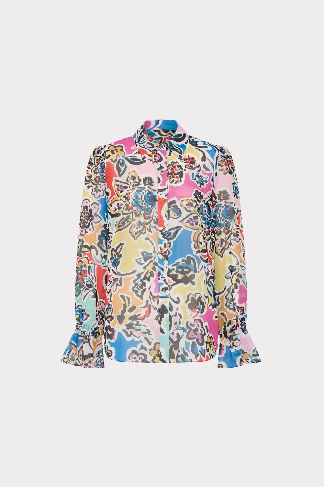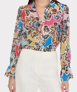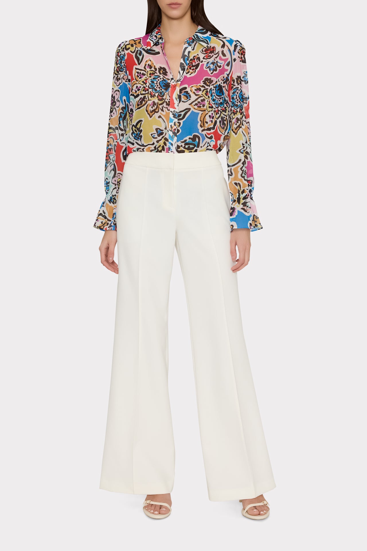 This lightweight button-down has an understated sharp-edged collar and ruffles at the cuff for added charm. Pair it with your favorite MILLY skirts, or wide-leg pants—the options are endless.