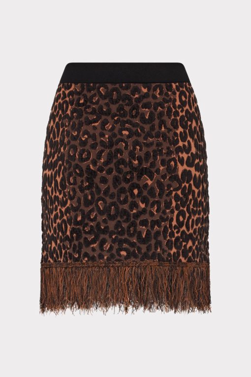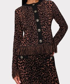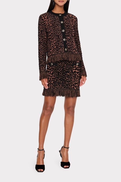 Crafted from heavy knit fabrication with tons of stretch, this leopard print mini skirt is adorned with prim pocket details, military-style gold buttons at the hip, and fringe at the hemline. For the full look, pair it with its coordinating Kaia Fringe Cardigan jacket.