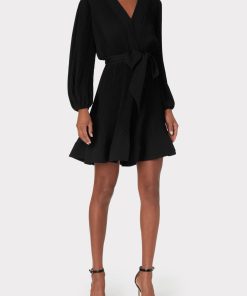 This black pleated short dress features a slim peasant sleeve, a v-neckline, a pleated skirt, and a tie at the waist for added shape. It works so well for both day and night.