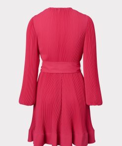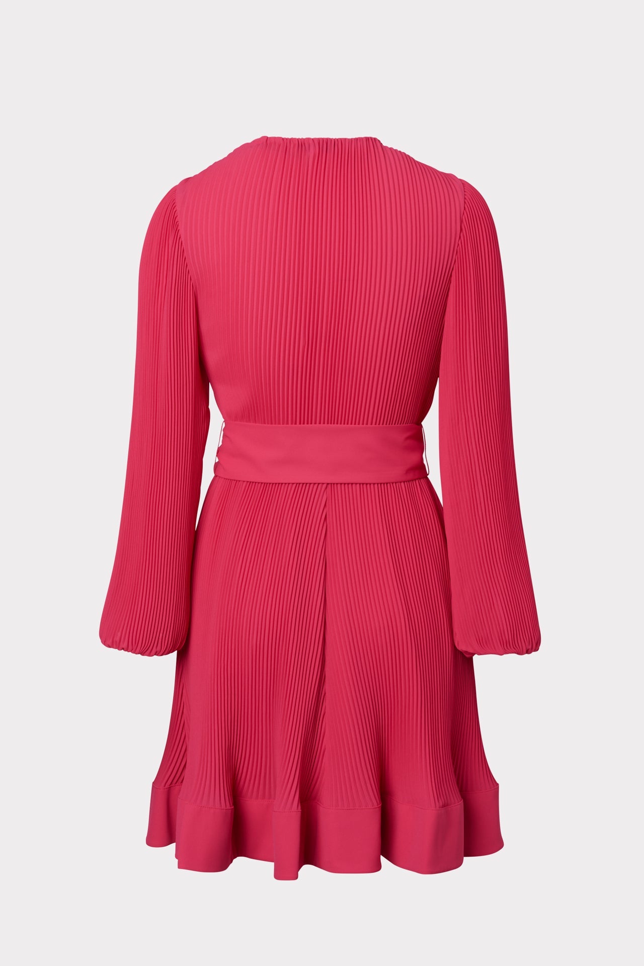 This pink pleated short dress features a slim peasant sleeve, a v-neckline, a pleated skirt, and a tie at the waist for added shape. It works so well for both day and night.