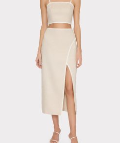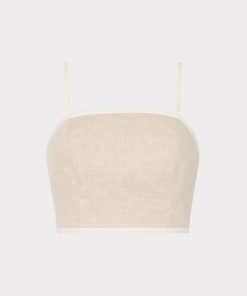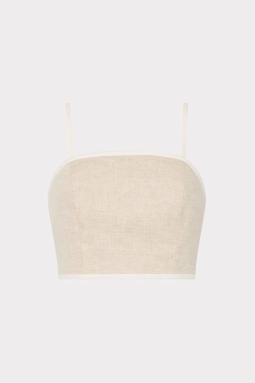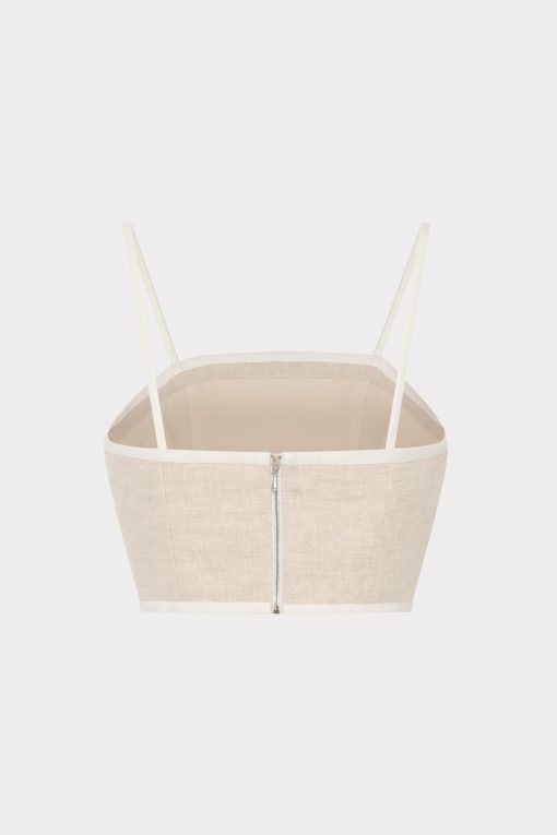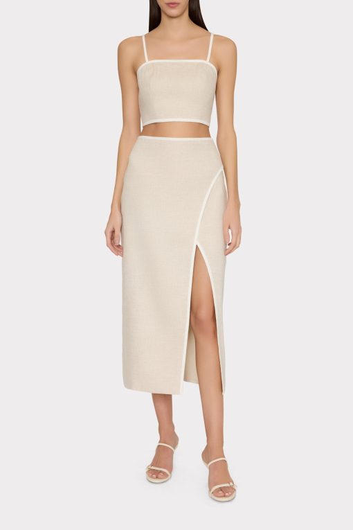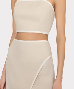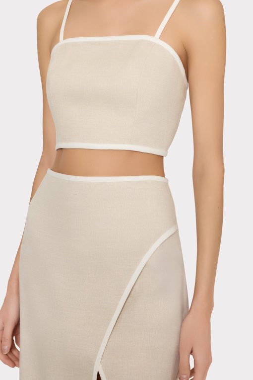The Nyrie crop top is cut a luxurious linen that’s contrasted by white piping along the edges. For the full look, wear it with its coordinating Neriya Contrast Linen Skirt.