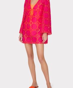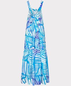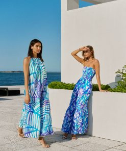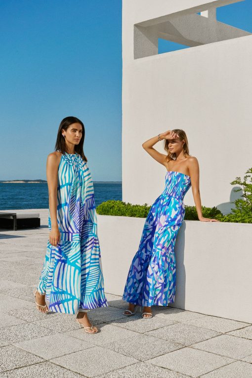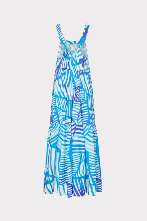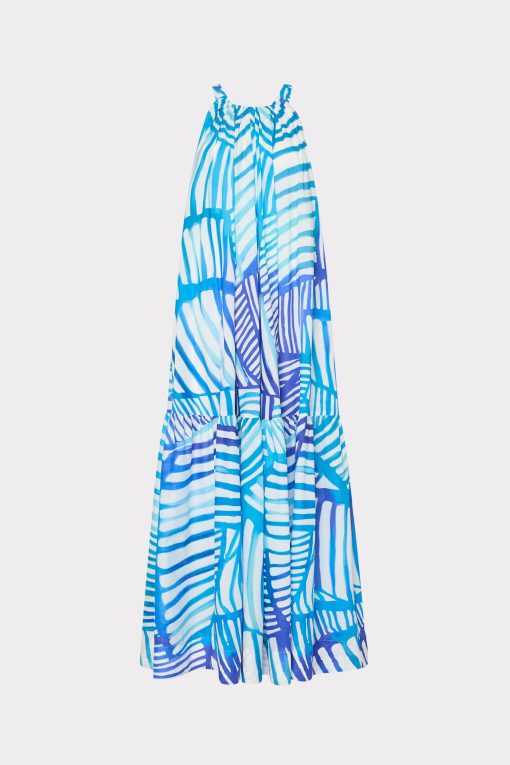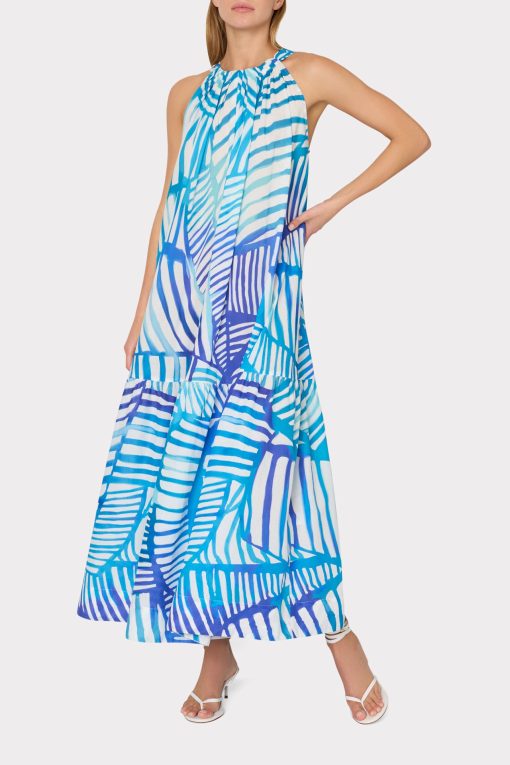 Perfect for your next beach holiday, this halter maxi features an eye-catching tropical print done in alternating light and dark blues. Cut from 100% cotton poplin, it has halter neckline and a breezy relax fit silhouette that flares out. Style yours over a MILLY swimsuit or with neutral accessories.
