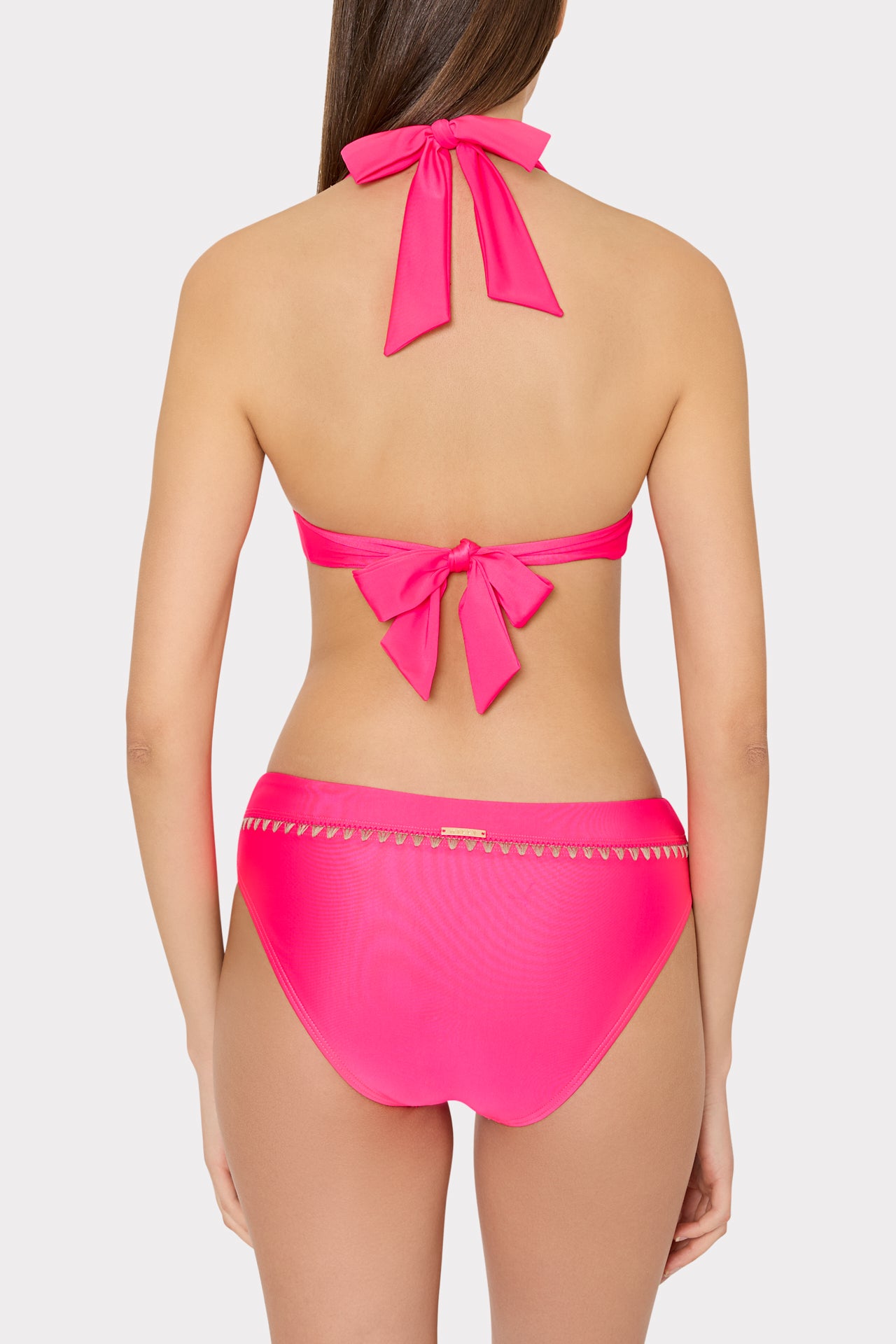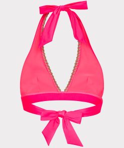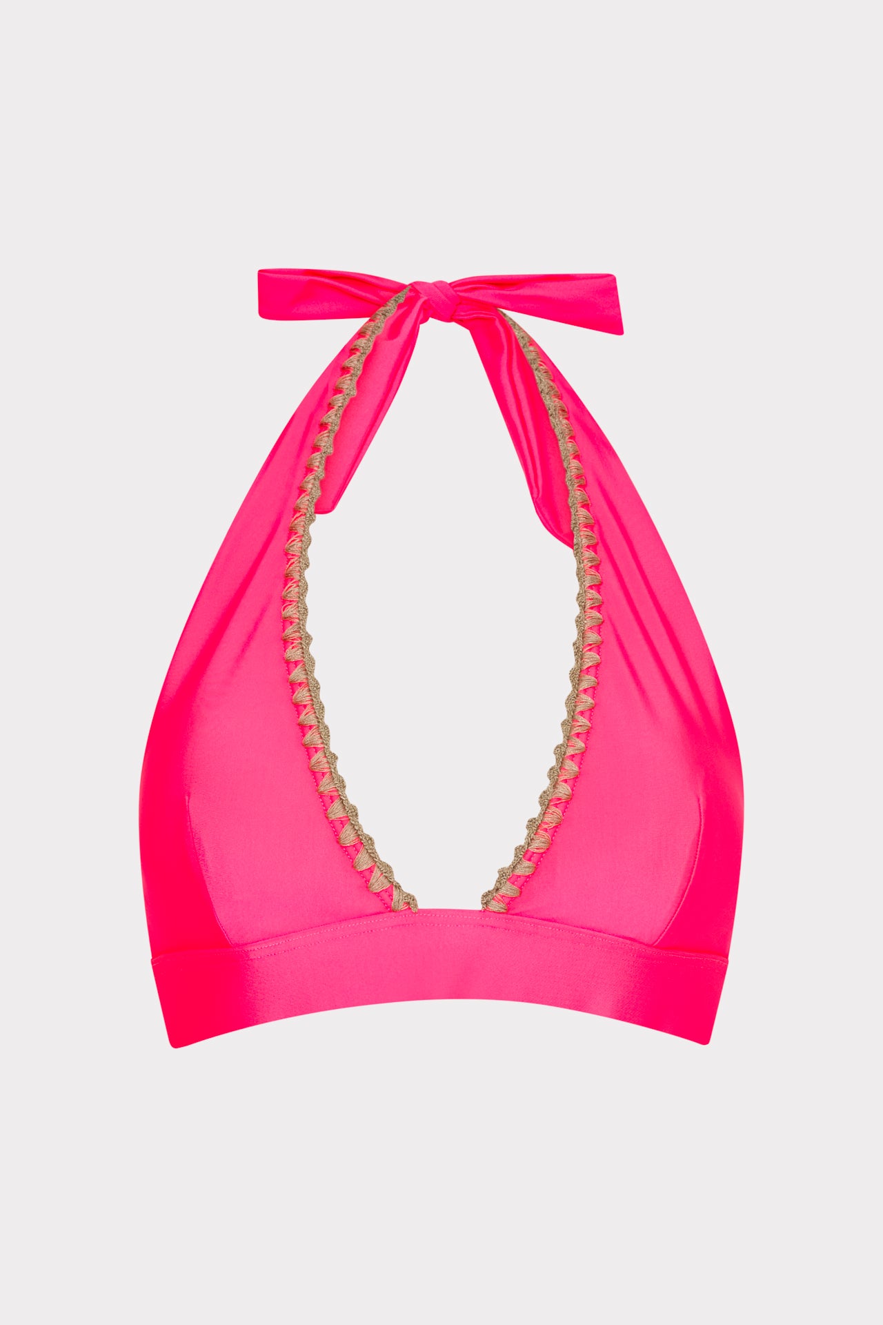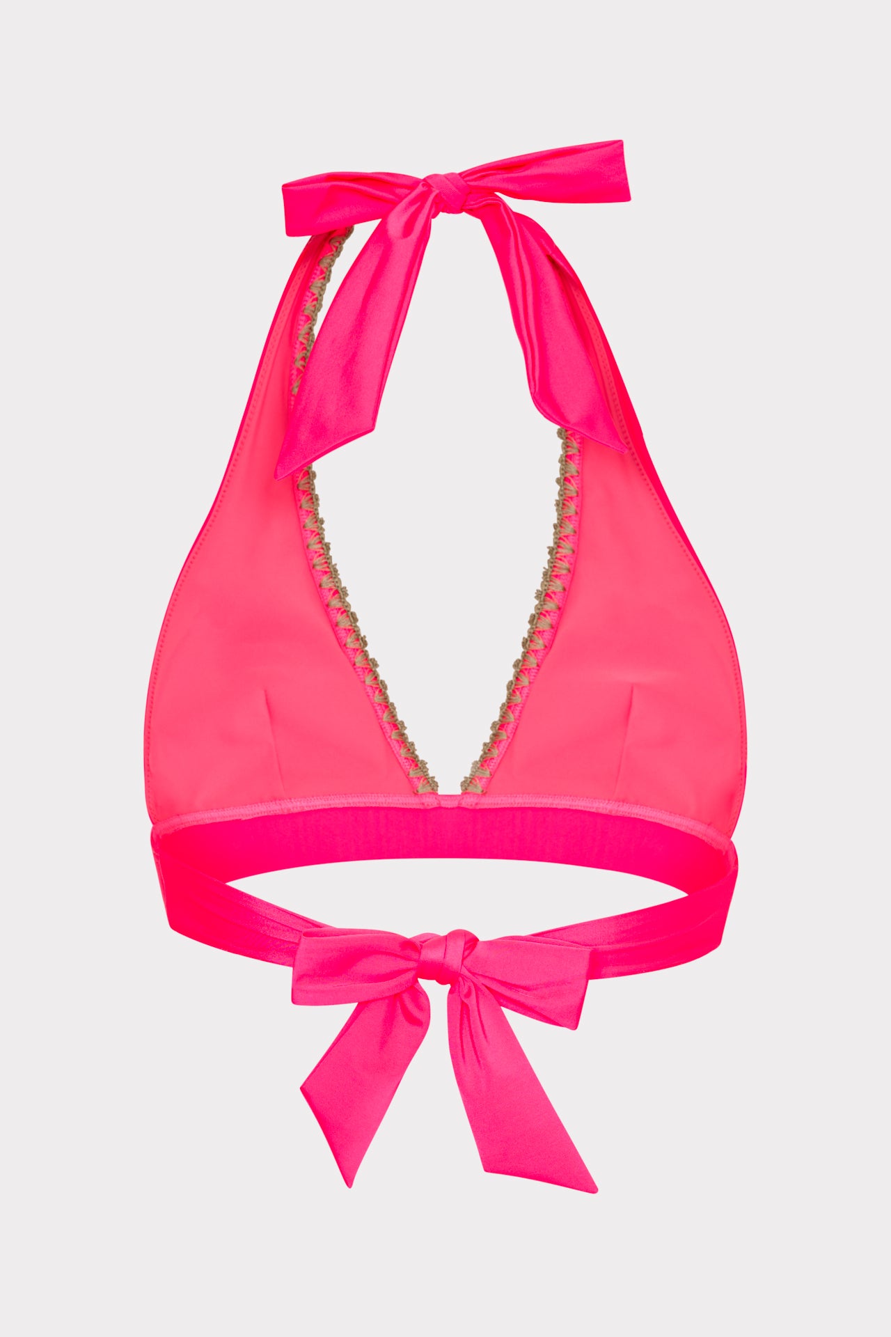 Made from Carvico Vita swim fabric, this pink halter bikini top is accented with a single tan-colored crochet stitch around the neckline. In true halter style fashion, it ties at the back and at the back of the neck. Wear it with its coordinating Crochet Stitch Bikini bottom and your favorite MILLY cover-up.