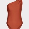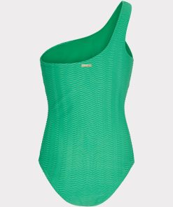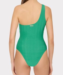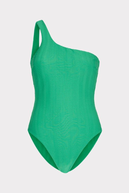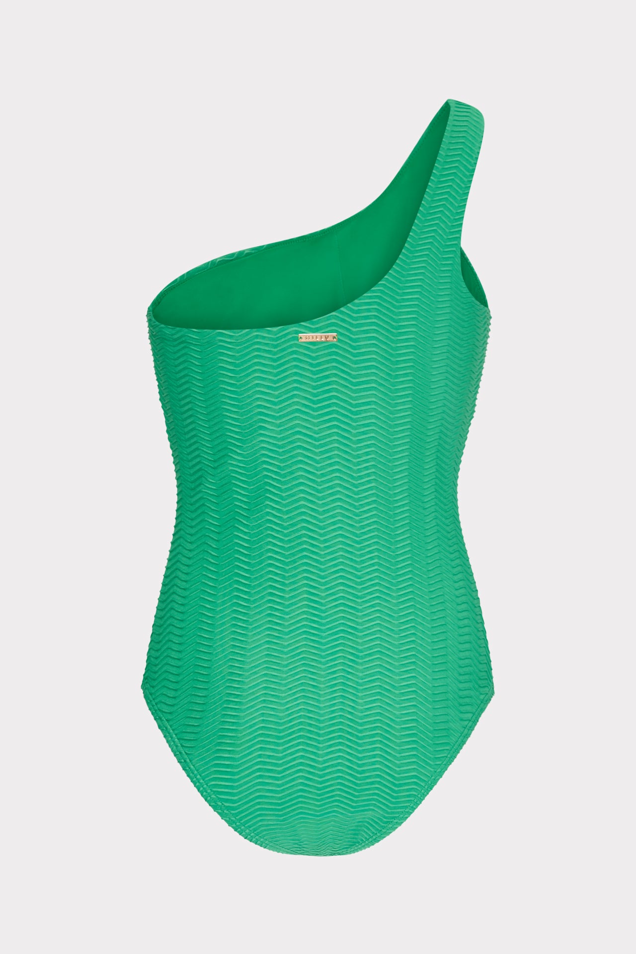 This simple, but stunning one-piece swimsuit is designed with a chic, one-shoulder silhouette. It’s made from our luxurious Spanish swim fabric that’s done in a textured, chevron print. It features built-in, yet removable, cups and provides medium brief coverage.