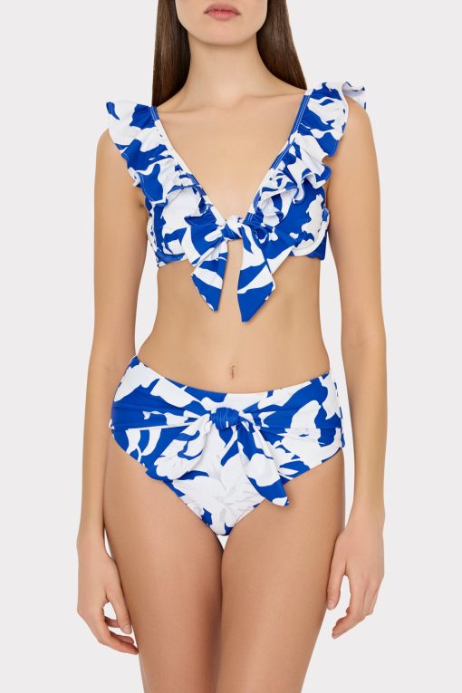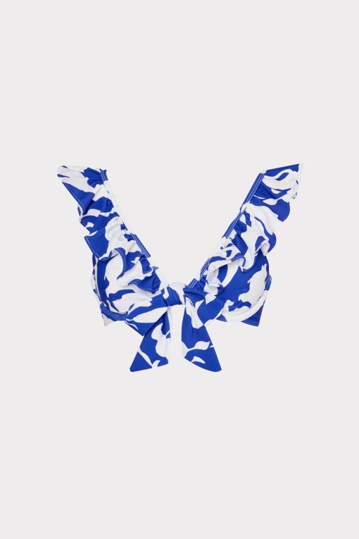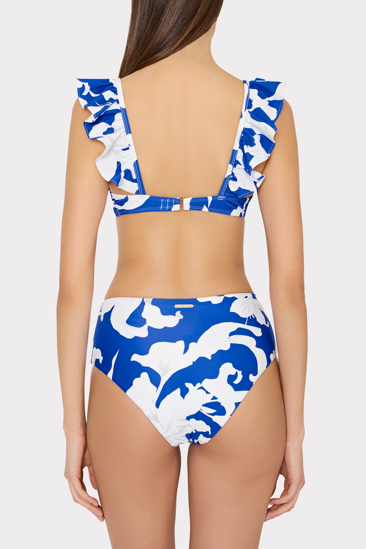 Our Ruffle Bikini Top is a classic underwire style adorned with a ruffle that trims the entire top of the neckline—creating a flirty, ruffly strap. It’s made from our smoothing stretch swim fabric that’s done in our new Lily Silhouette print. Wear it with its coordinating Lily Silhouette Tie Bikini Bottom and any of our coordinating MILLY cover-ups.