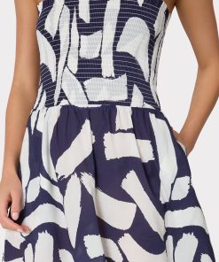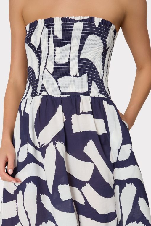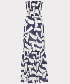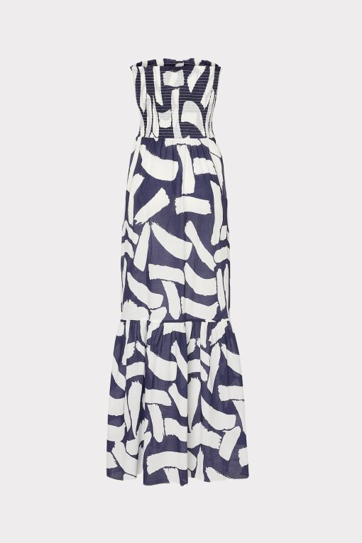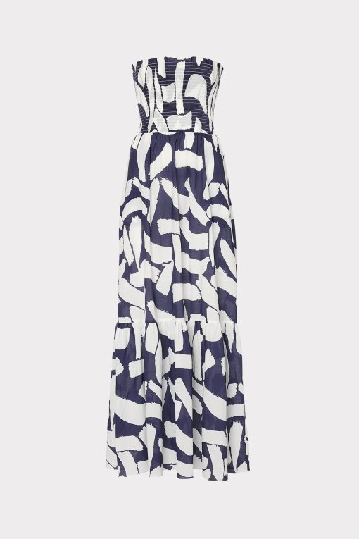 Perfect for your next beach holiday, the Olen maxi features our new, eye-catching navy and ecru Graphic Brushstroke print. Cut from cotton poplin, it has a strapless neckline with smocking throughout the bodice. Style yours with MILLY swimwear and neutral accessories.
