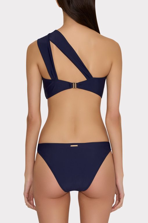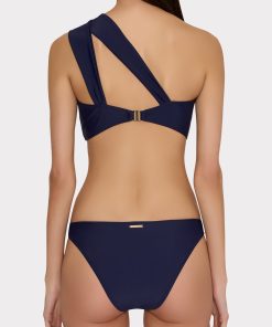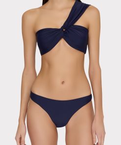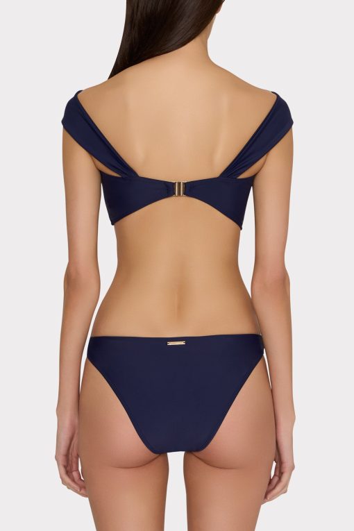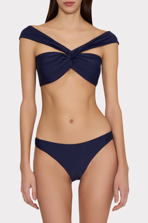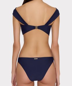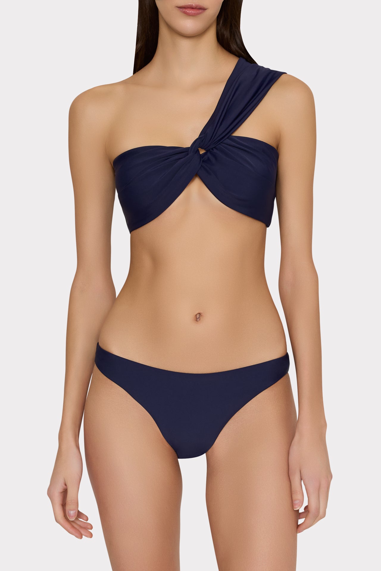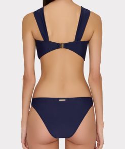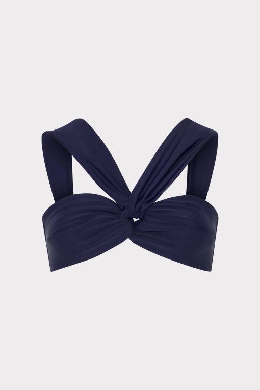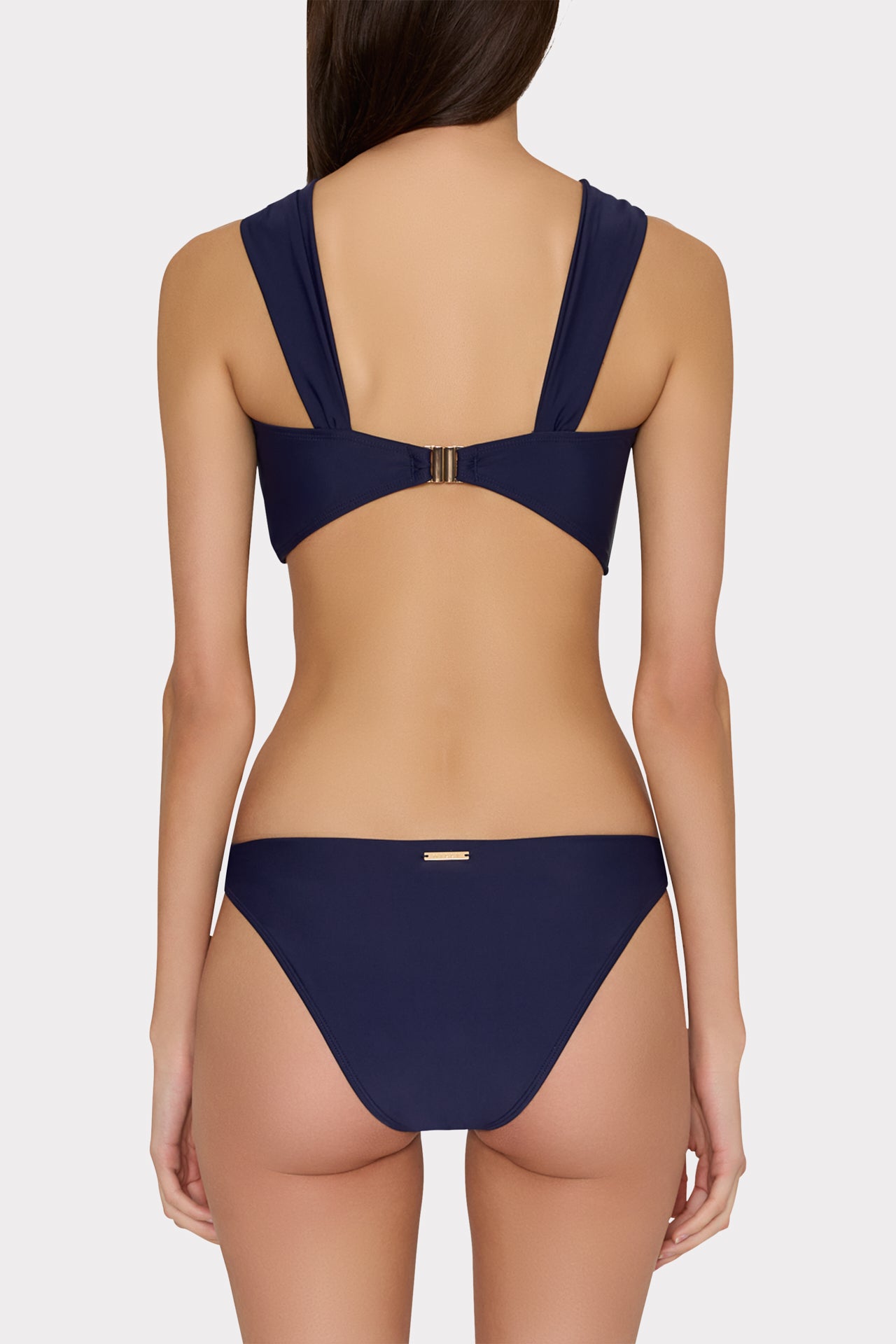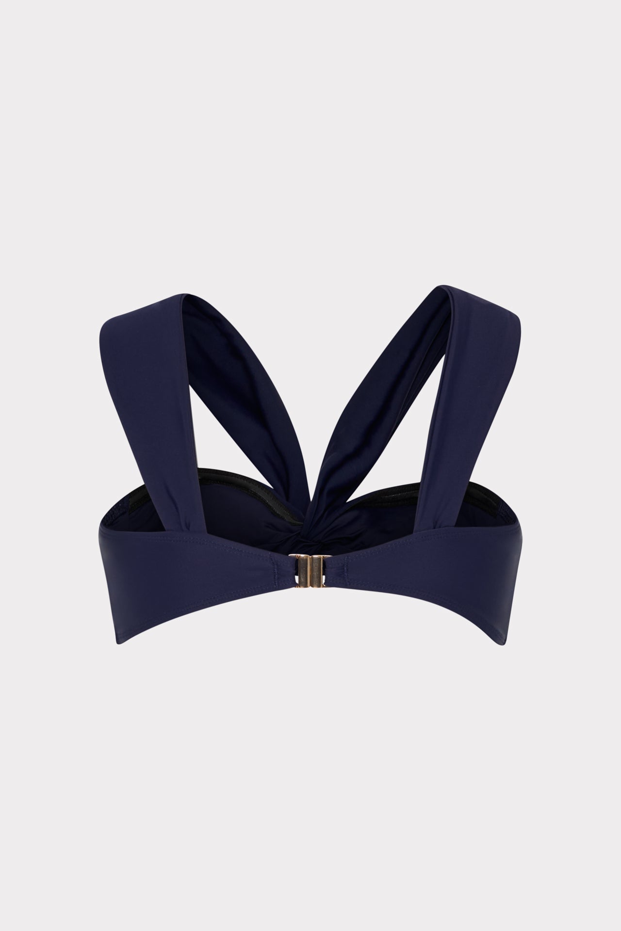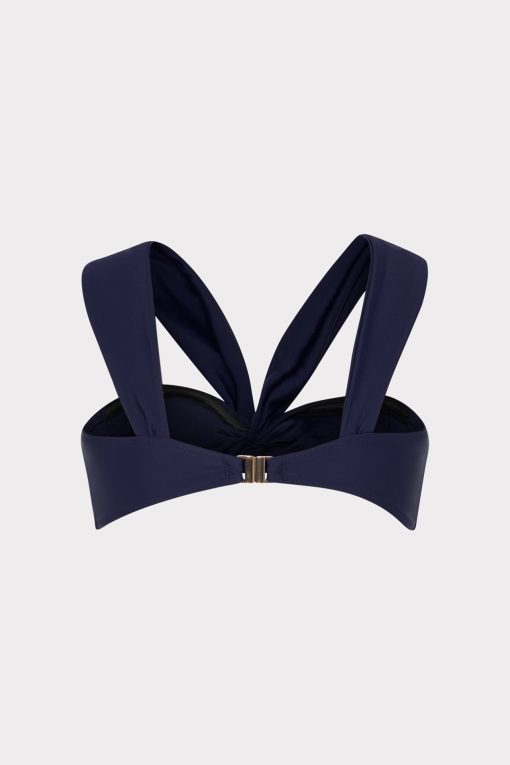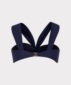 Made from our smoothing stretch Italian swim fabric, this elegant bandeau-style bikini top has moveable straps that can be worn off-the-shoulder or twisted across the chest. It has removable cups and clasps in the back to close. New for this season, it’s offered in a solid navy that goes with our navy striped sarong.