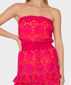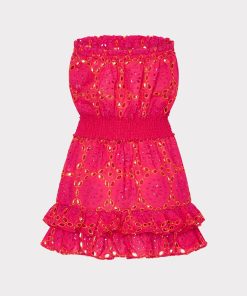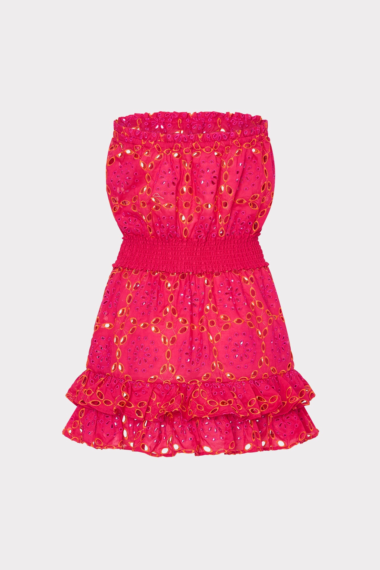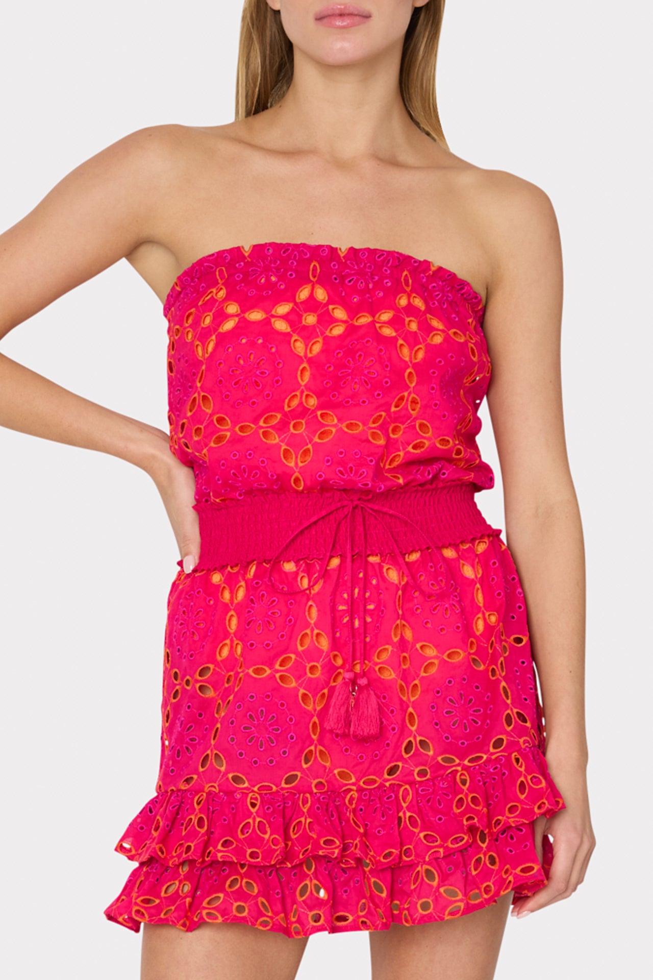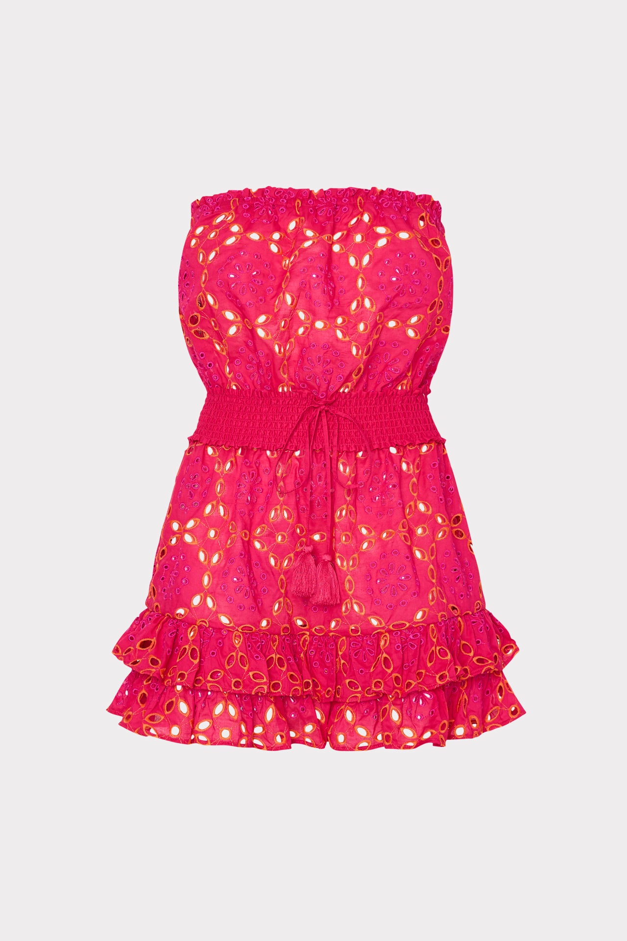 Cut from a lightweight eyelet cotton with a two-tone effect, this strapless dress style has elastic across the neckline and smocking detail at the waist. It falls to a mini length, ruffle adorned hemline and is finished with a tassel tie at the waist. Wear it as a swim cover-up or on its own with flats.