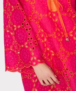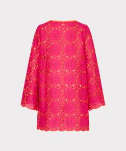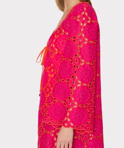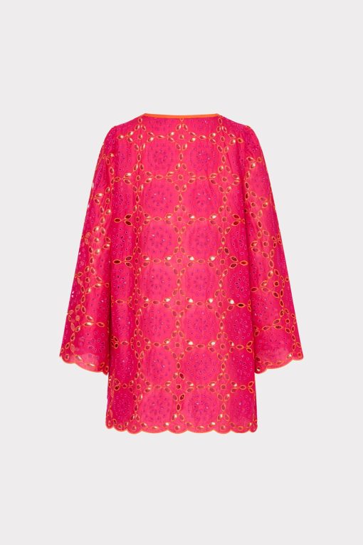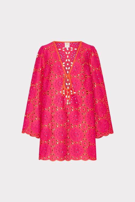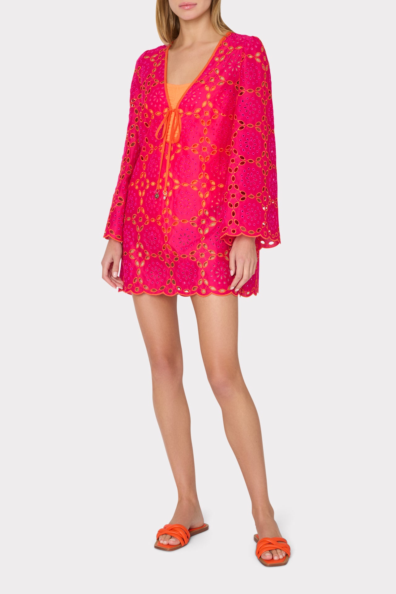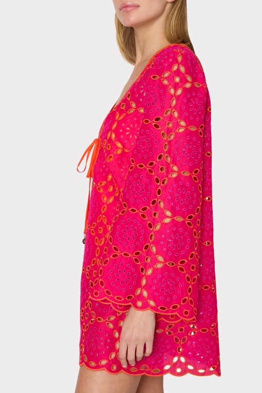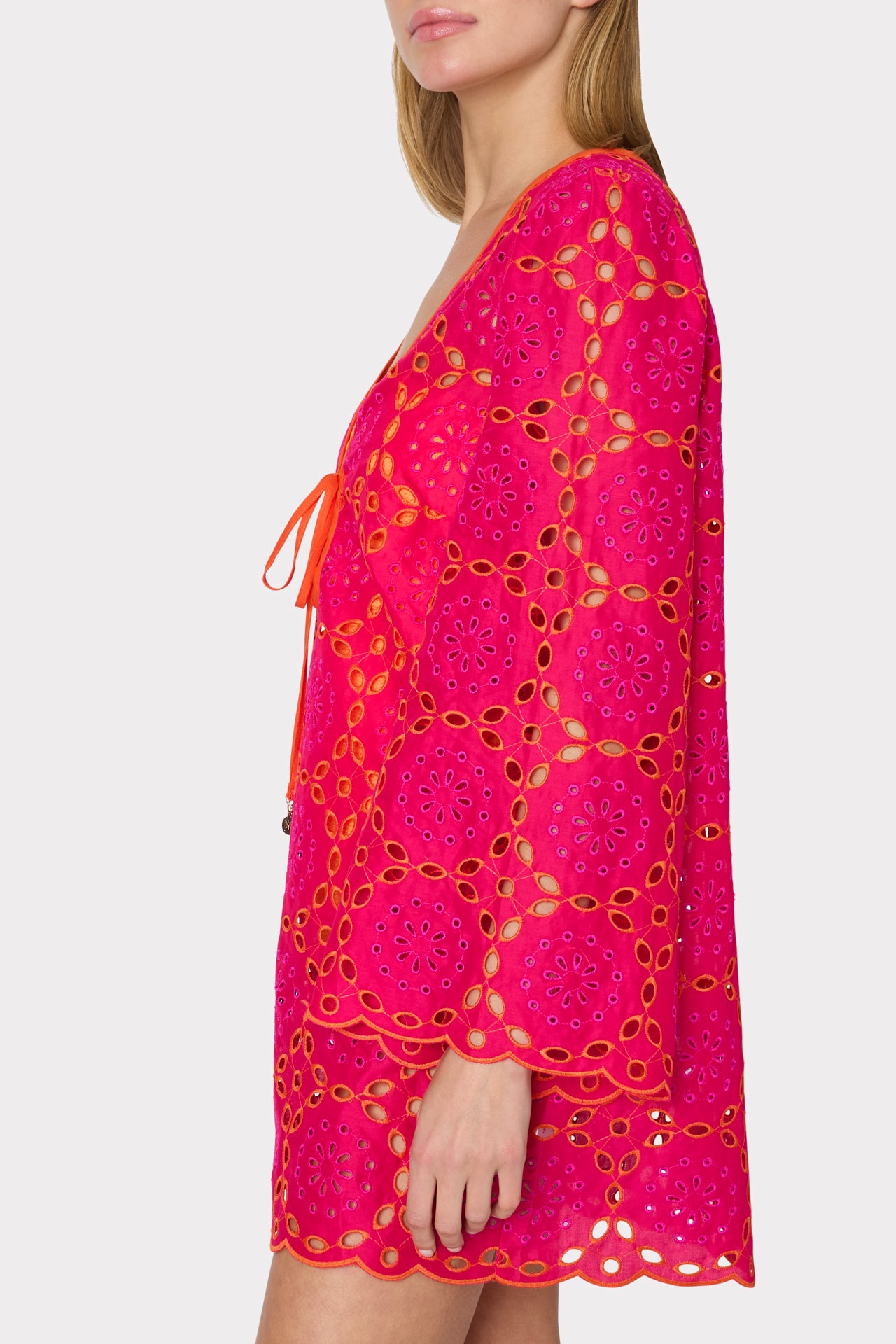 Cut from a sheer cotton blend eyelet fabric, this mini dress style is a versatile throw on that pairs well with every suit in the MILLY Cabana collection. It has long, roomy sleeves, a deep neckline with a tie closure and is finished with a scalloped hemline.