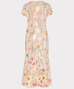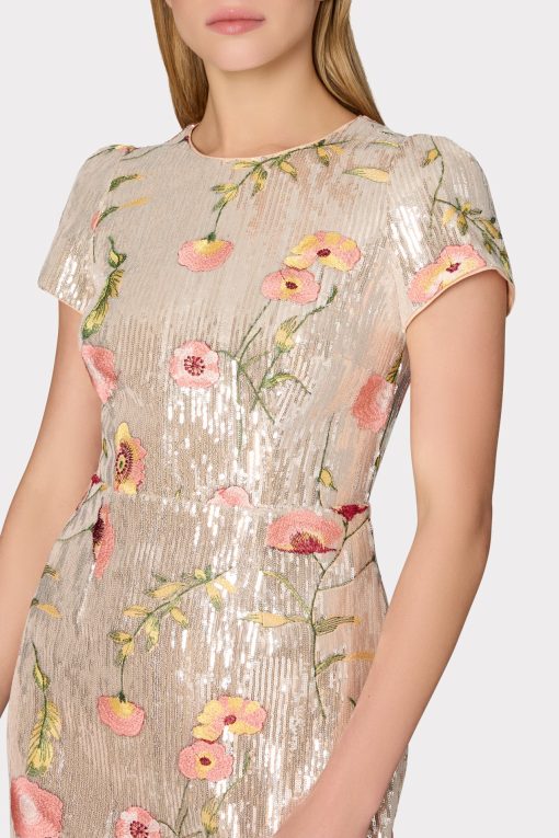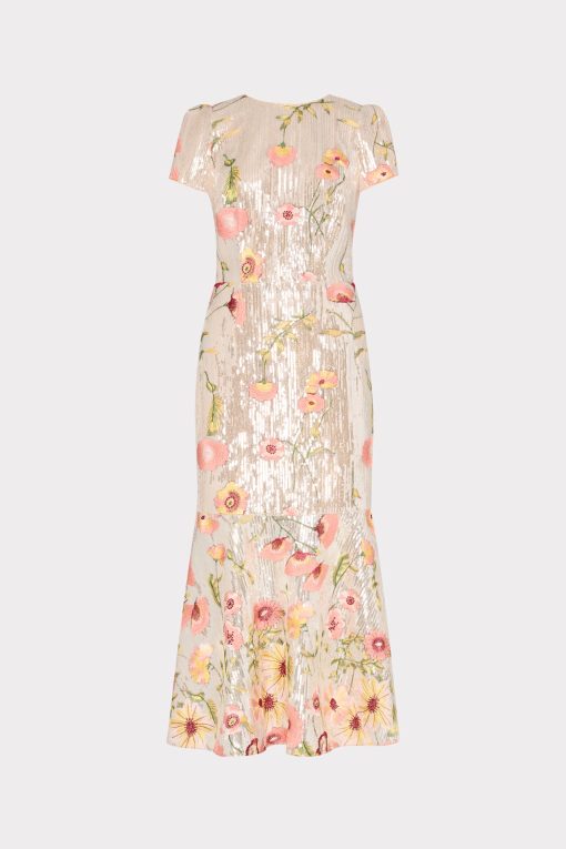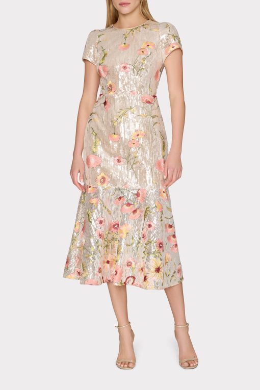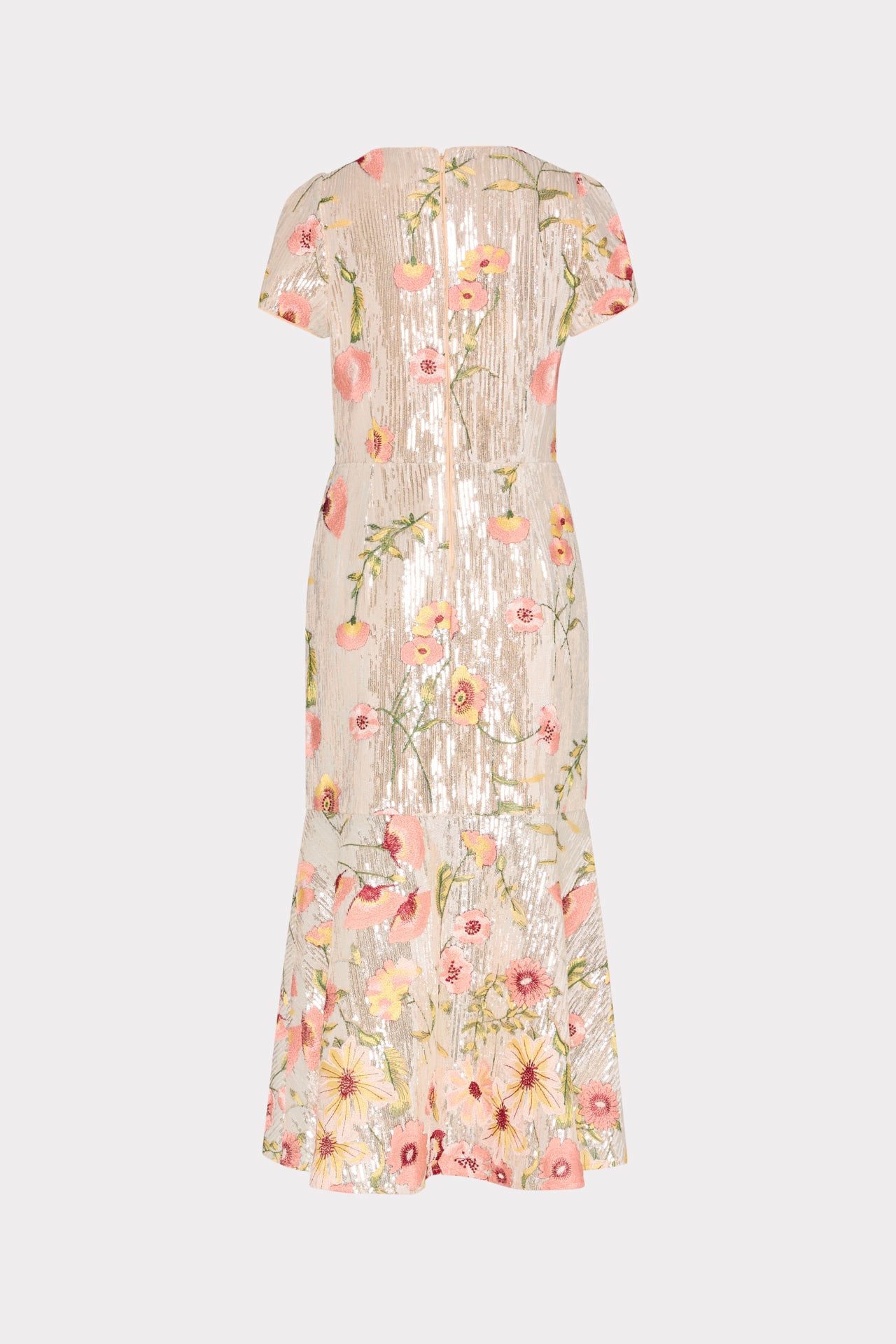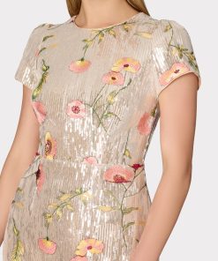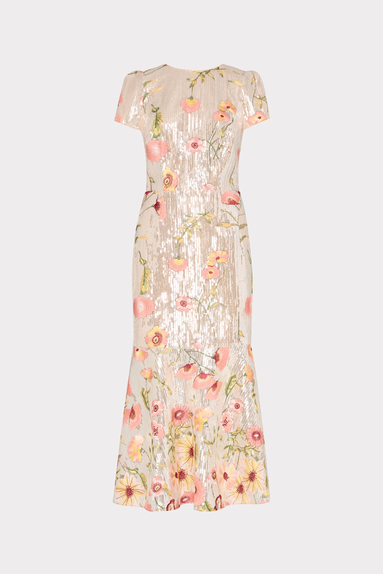 Introducing the Tahlia Floral Sequins Embroidery Dress, a chic midi dress perfect for a cocktail party or a night out. This dress features a flared skirt and short cap sleeves, making it a versatile piece for any formal event or gala. With a sequin overlay and stunning floral details, this dress is sure to turn heads at any occasion.