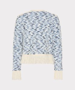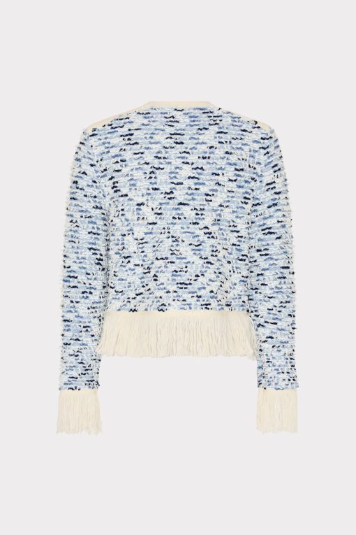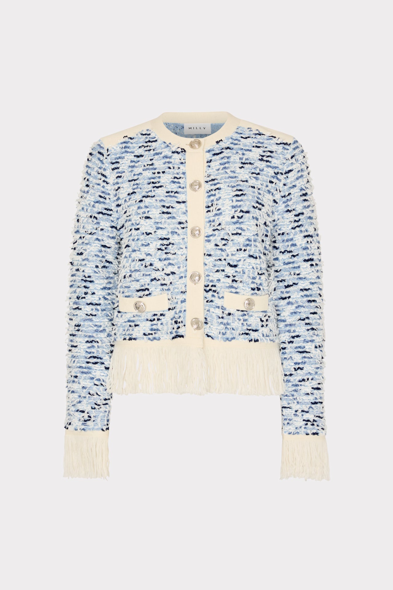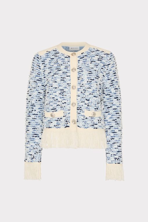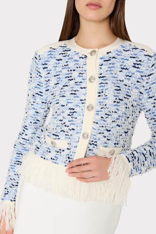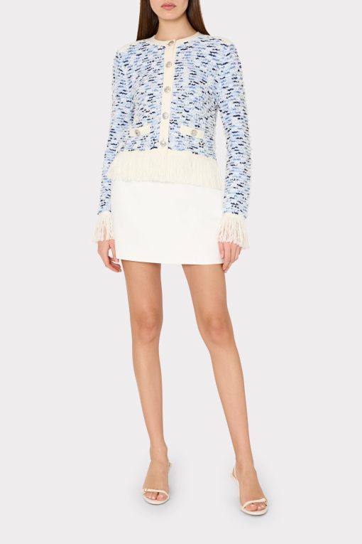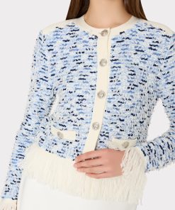 Our iconic cardigan jacket gets a new twist this season with fun, fringe detailing at the hemline. The intricate gold buttons can be fastened or worn undone. Wear it over our coordinating Fringed Textured Tweed Mini Dress.
