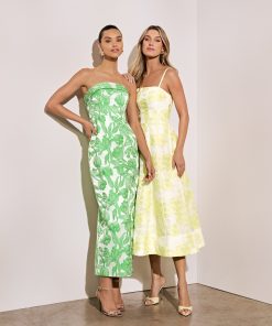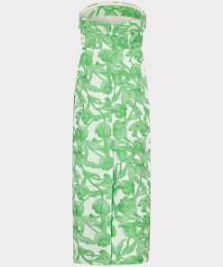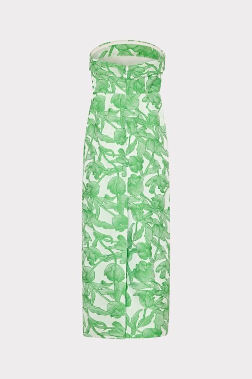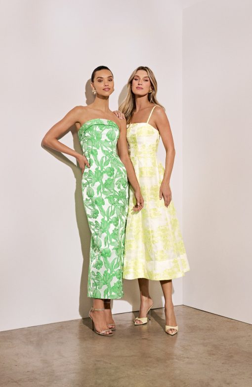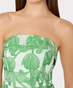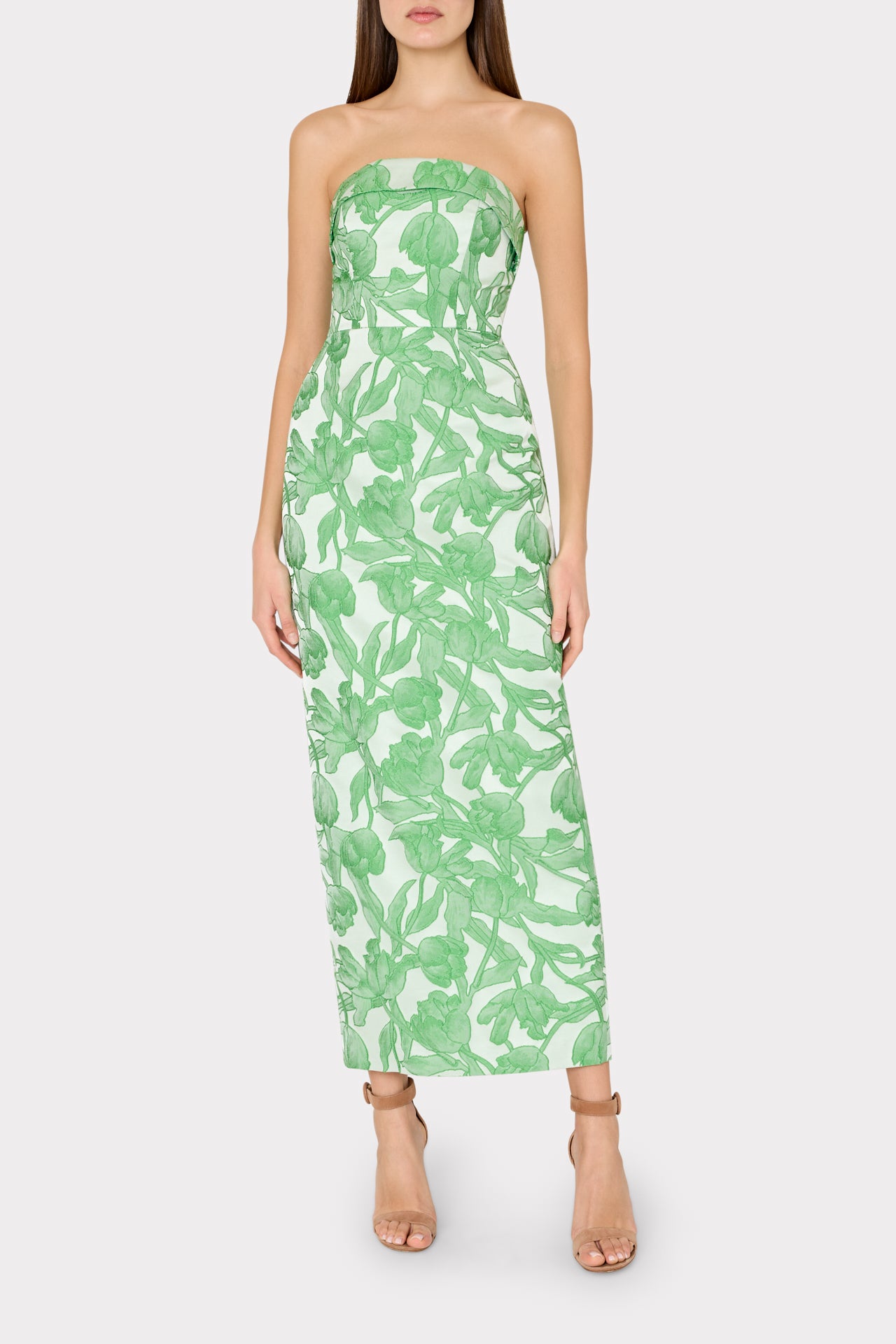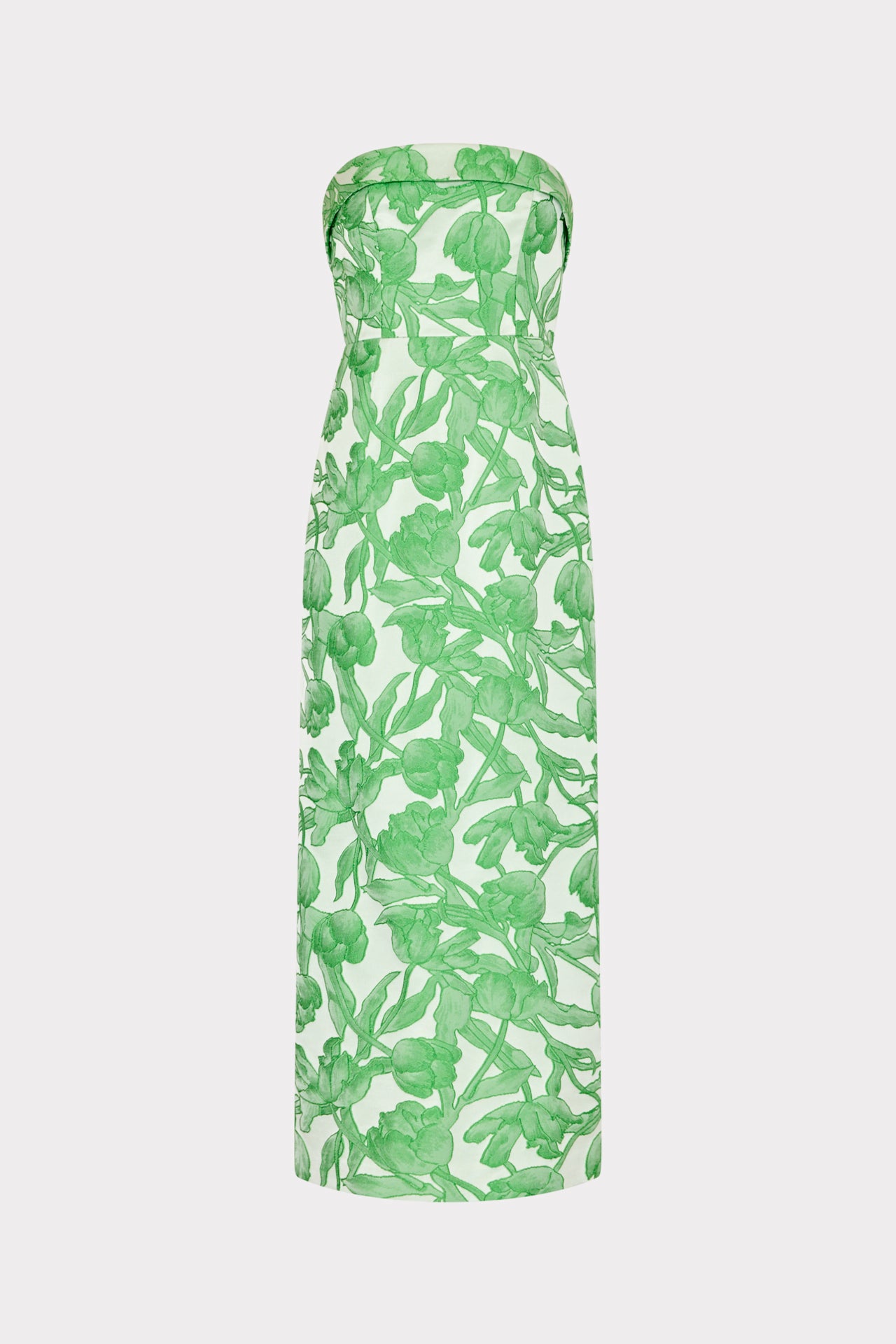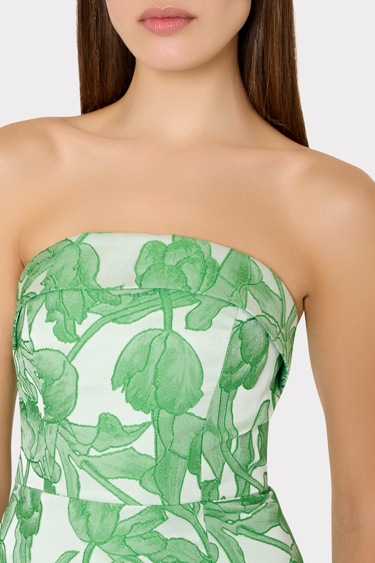 Cut from a sophisticated green and white jacquard Tulip Print, this strapless silhouette hits at a midi length—perfect for weddings, cocktail parties, or any warm-weather event. Style yours this Spring with a simple strappy heel and a small clutch.