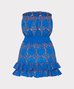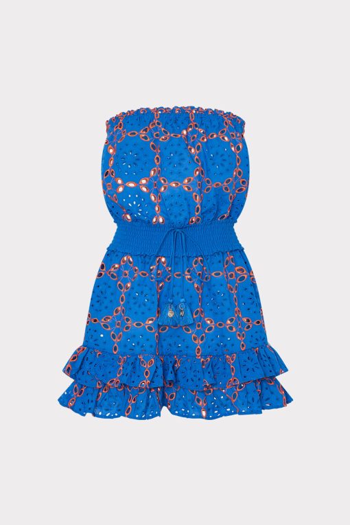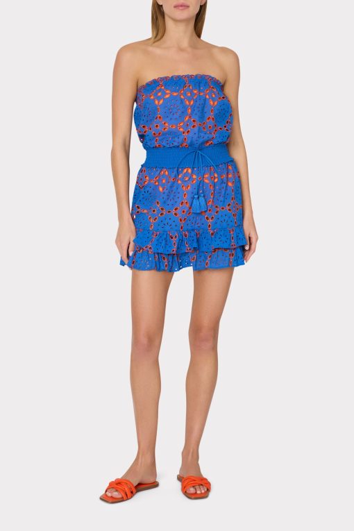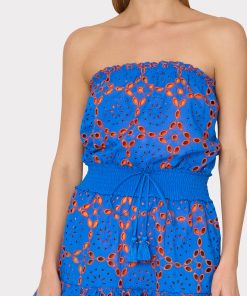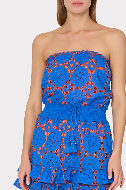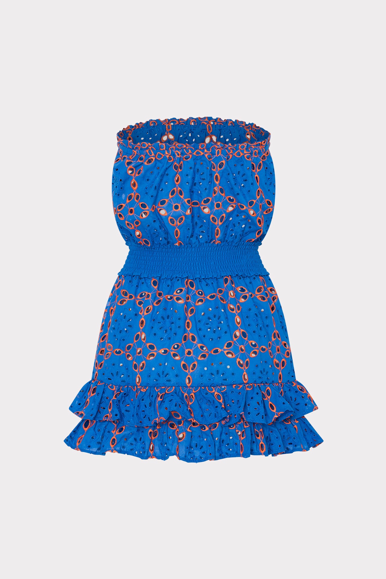 Cut from a lightweight eyelet cotton with a two-tone effect, this strapless dress style has elastic across the neckline and smocking detail at the waist. It falls to a mini length, ruffle adorned hemline and is finished with a tassel tie at the waist. Wear it as a swim cover-up or on its own with flats.